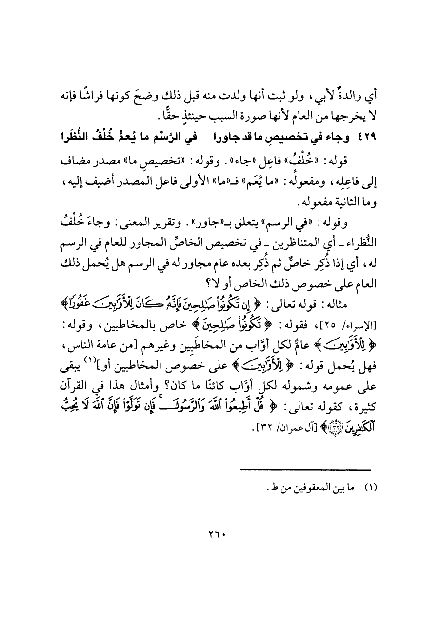 مثاله: قوله تعالى: {إِنْ تَكُونُوا صَالِحِينَ فَإِنَّهُ كَانَ لِلْأَوَّابِينَ غَفُورًا} [الإسراء/ ٢٥]، فقوله: {تَكُونُوا صَالِحِينَ} خاص بالمخاطبين، وقوله: {لِلْأَوَّابِينَ} عامٌّ لكل أوَّاب من المخاطَبِين وغيرهم [من عامة الناس، فهل يُحمل قوله: {لِلْأَوَّابِينَ} على خصوص المخاطبين أو] (¬١) يبقى على عمومه وشموله لكل أوَّاب كائنًا ما كان؟ وأمثال هذا في القرآن كثيرة، كقوله تعالى: {قُلْ أَطِيعُوا اللَّهَ وَالرَّسُولَ فَإِنْ تَوَلَّوْا فَإِنَّ اللَّهَ لَا يُحِبُّ الْكَافِرِينَ (٣٢)} [آل عمران/ ٣٢].