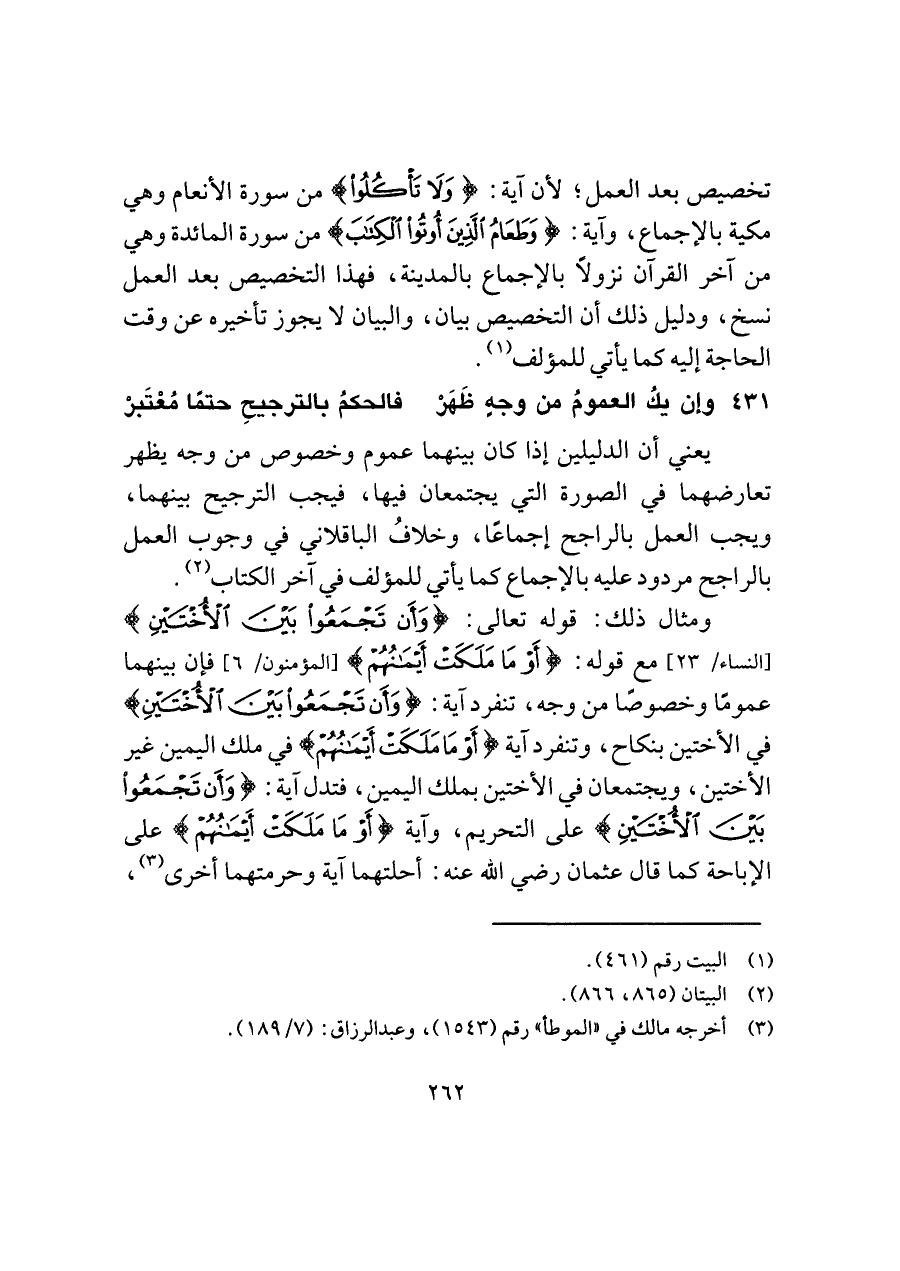 ومثال ذلك: قوله تعالى: {وَأَنْ تَجْمَعُوا بَيْنَ الْأُخْتَيْنِ} [النساء/ ٢٣] مع قوله: {أَوْ مَا مَلَكَتْ أَيْمَانُهُمْ} [المؤمنون/ ٦] فإن بينهما عمومًا وخصوصًا من وجه، تنفرد آية: {وَأَنْ تَجْمَعُوا بَيْنَ الْأُخْتَيْنِ} في الأختين بنكاح، وتنفرد آية {أَوْ مَا مَلَكَتْ أَيْمَانُهُمْ} في ملك اليمين غير الأختين، ويجتمعان في الأختين بملك اليمين، فتدل آية: {وَأَنْ تَجْمَعُوا بَيْنَ الْأُخْتَيْنِ} على التحريم، وآية {أَوْ مَا مَلَكَتْ أَيْمَانُهُمْ} على الإباحة كما قال عثمان رضي اللَّه عنه: أحلتهما آية وحرمتهما أخرى (¬٣)،