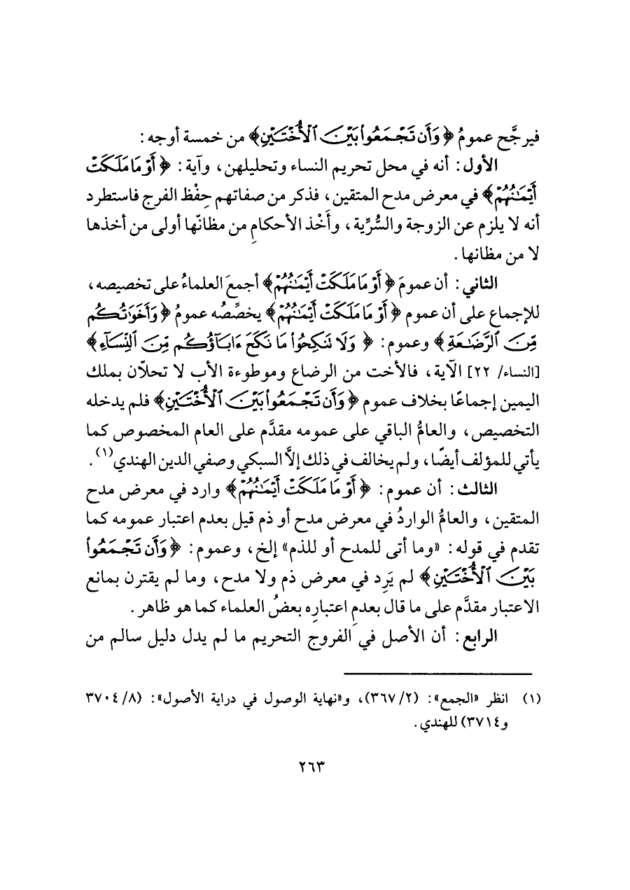 فيرجَّح عمومُ {وَأَنْ تَجْمَعُوا بَيْنَ الْأُخْتَيْنِ} من خمسة أوجه: