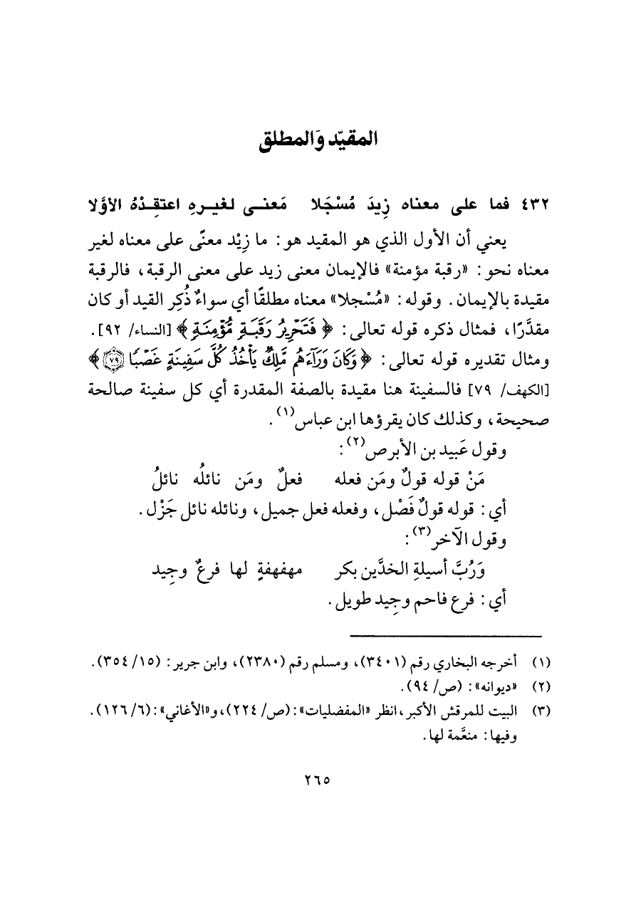 يعني أن الأولى الذي هو المقيد هو: ما زِيْد معنًى على معناه لغير معناه نحو: "رقبة مؤمنة" فالإيمان معنى زيد على معنى الرقبة، فالرقبة مقيدة بالإيمان. وقوله: "مُسْجلا" معناه مطلقًا أي سواءٌ ذُكِر القيد أو كان مقدَّرًا، فمثال ذكره قوله تعالى: {فَتَحْرِيرُ رَقَبَةٍ مُؤْمِنَةٍ} [النساء/ ٩٢]. ومثال تقديره قوله تعالى: {وَكَانَ وَرَاءَهُمْ مَلِكٌ يَأْخُذُ كُلَّ سَفِينَةٍ غَصْبًا (٧٩)} [الكهف/ ٧٩] فالسفينة هنا مقيدة بالصفة المقدرة أي كل سفينة صالحة صحيحة، وكذلك كان يقرؤها ابن عباس (¬١).