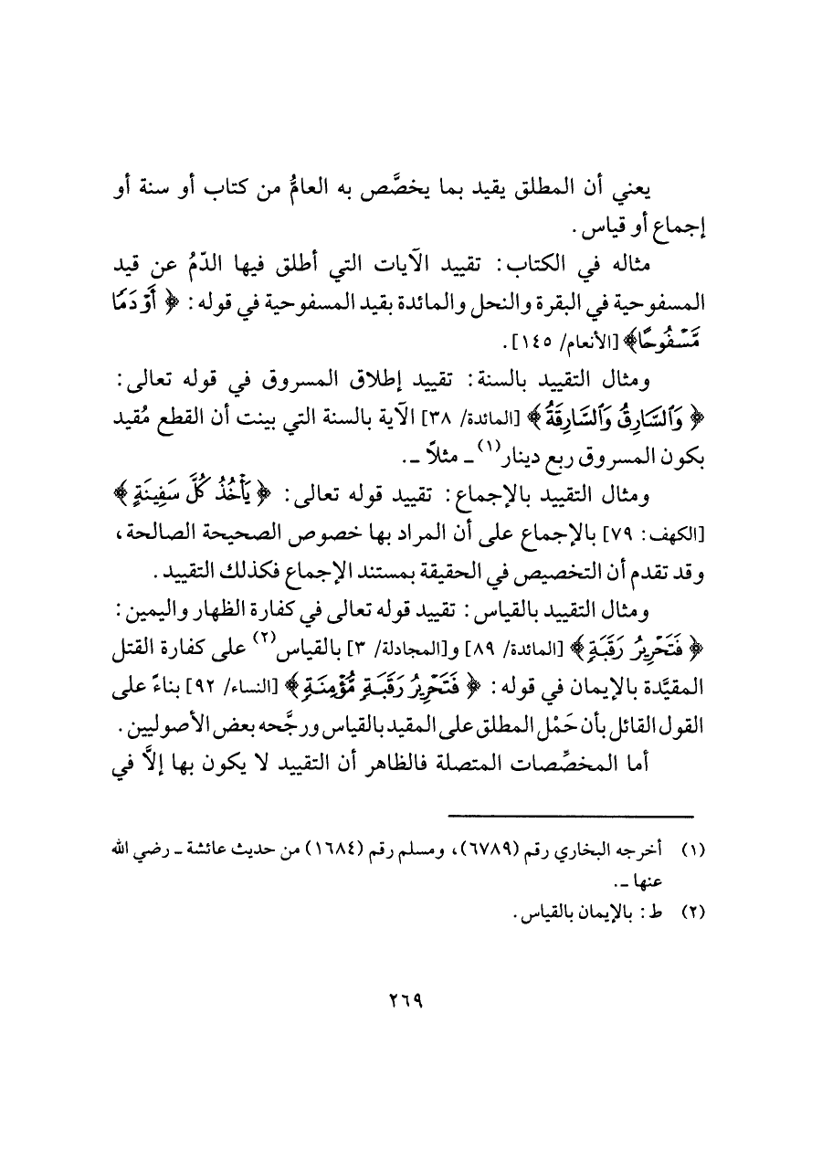 ومثال التقييد بالقياس: تقييد قوله تعالى في كفارة الظهار واليمين: {فَتَحْرِيرُ رَقَبَةٍ} [المائدة/ ٨٩] و [المجادلة/ ٣] بالقياس (¬٢) على كفارة القتل المقيَّدة بالإيمان في قوله: {فَتَحْرِيرُ رَقَبَةٍ مُؤْمِنَةٍ} [النساء/ ٩٢] بناءً على القول القائل بأن حَمْل المطلق على المقيد بالقياس ورجَّحه بعض الأصوليين.