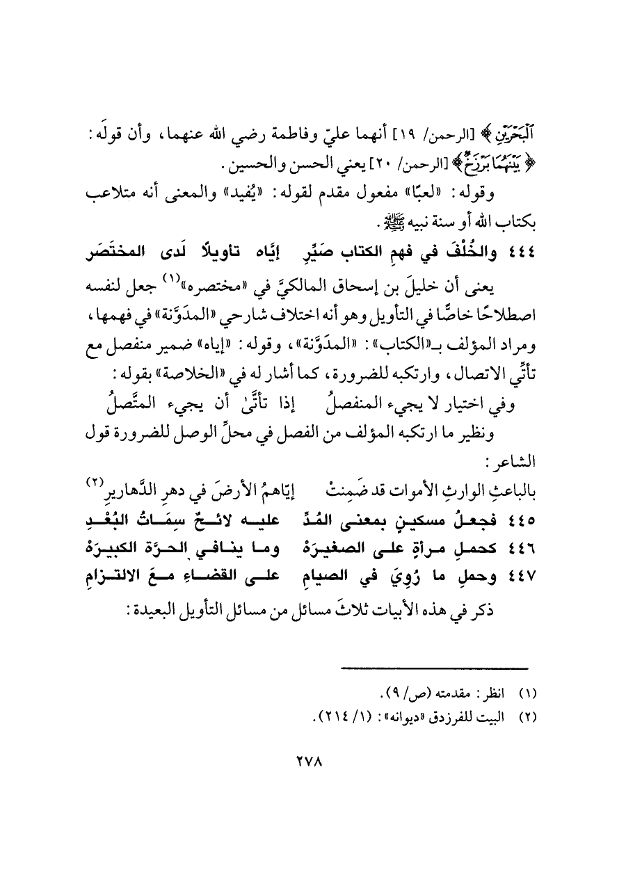 ذكر في هذه الأبيات ثلاثَ مسائل من مسائل التأويل البعيدة: