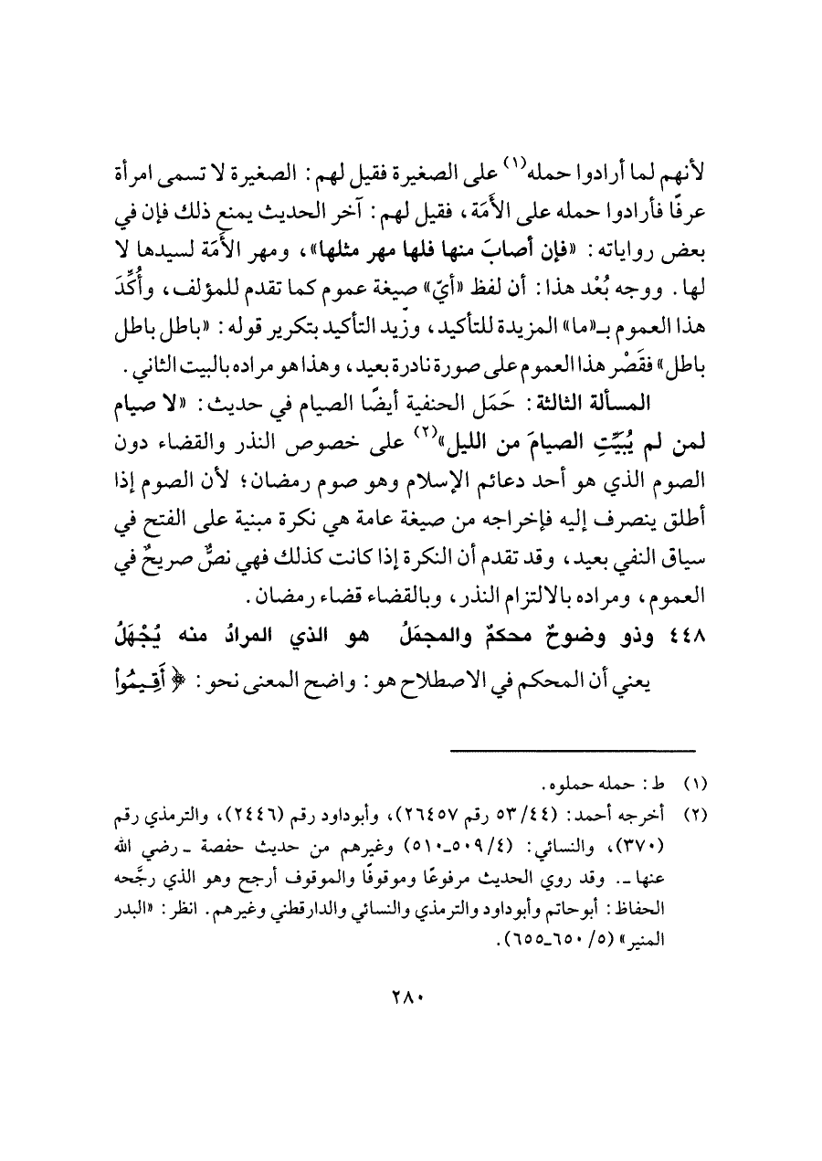 المسألة الثالثة: حَمَل الحنفية أيضًا الصيام في حديث: "لا صيام لمن لم يُبَيِّتِ الصيامَ من الليل" (¬٢) على خصوص النذر والقضاء دون الصوم الذي هو أحد دعائم الإسلام وهو صوم رمضان؛ لأن الصوم إذا أطلق ينصرف إليه فإخراجه من صيغة عامة هي نكرة مبنية على الفتح في سياق النفي بعيد، وقد تقدم أن النكرة إذا كانت كذلك فهي نصٌّ صريحٌ في العموم، ومراده بالالتزام النذر، وبالقضاء قضاء رمضان.
