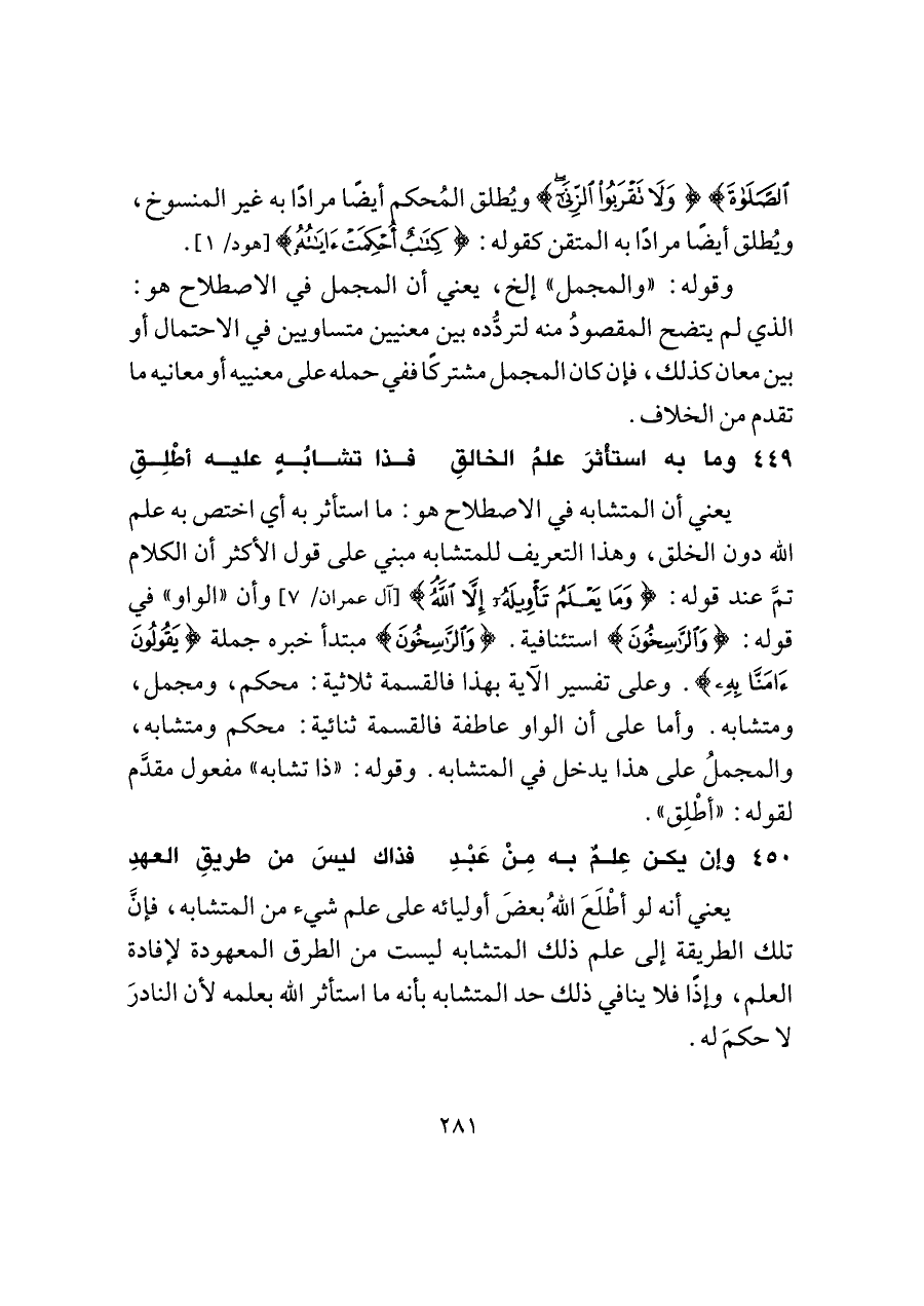 ٤٤٩ - وما به استأثرَ علمُ الخالقِ ... فذا تشابُهٍ عليه أطْلِقِ