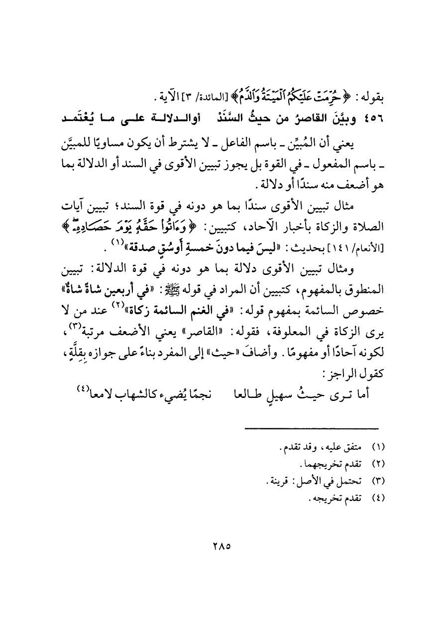 ومثال تبيين الأقوى دلالة بما هو دونه في قوة الدلالة: تبيين المنطوق بالمفهوم، كتبيين أن المراد في قوله -صلى اللَّه عليه وسلم-: "في أربعين شاةً شاةٌ" خصوص السائمة بمفهوم قوله: "في الغنم السائمة زكاة" (¬٢) عند من لا يرى الزكاة في المعلوفة، فقوله: "القاصر" يعني الأضعف مرتبة (¬٣)، لكونه آحادًا أو مفهومًا. وأضافَ "حيث" إلى المفرد بناءً على جوازه بِقِلَّةٍ، كقول الراجز: