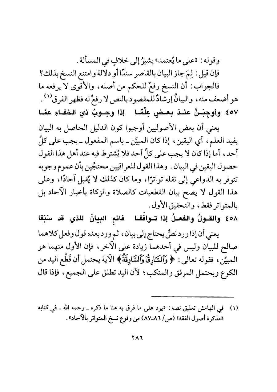 (¬١) في الهامش تعليق نصه: "يرد على ما فرق به هنا ما ذكره -رحمه اللَّه- في كتابه "مذكرة أصول الفقه" (ص/ ٨٦ - ٨٧) من وقوع نسخ المتواتر بالآحاد".