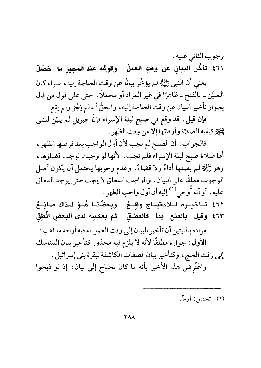 ٤٦١ - تأخّر البيانِ عن وقتِ العملْ ... وقوعْه عند المجيزِ ما حَصَلْ