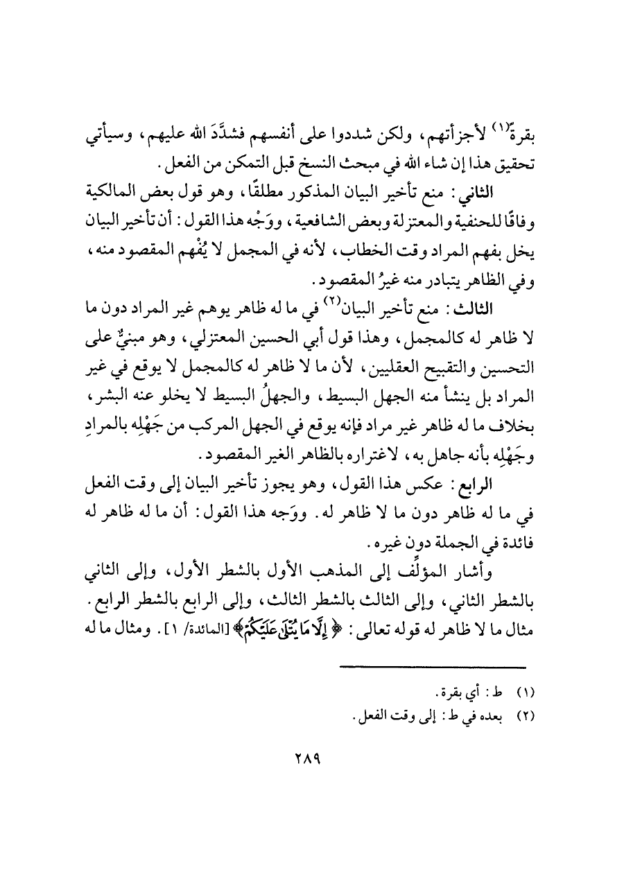الثاني: منع تأخير البيان المذكور مطلقًا، وهو قول بعض المالكية وفاقًا للحنفية والمعتزلة وبعض الشافعية، ووَجْه هذا القول: أن تأخير البيان يخل بفهم المراد وقت الخطاب، لأنه في المجمل لا يُفْهم المقصود منه، وفي الظاهر يتبادر منه غيرُ المقصود.