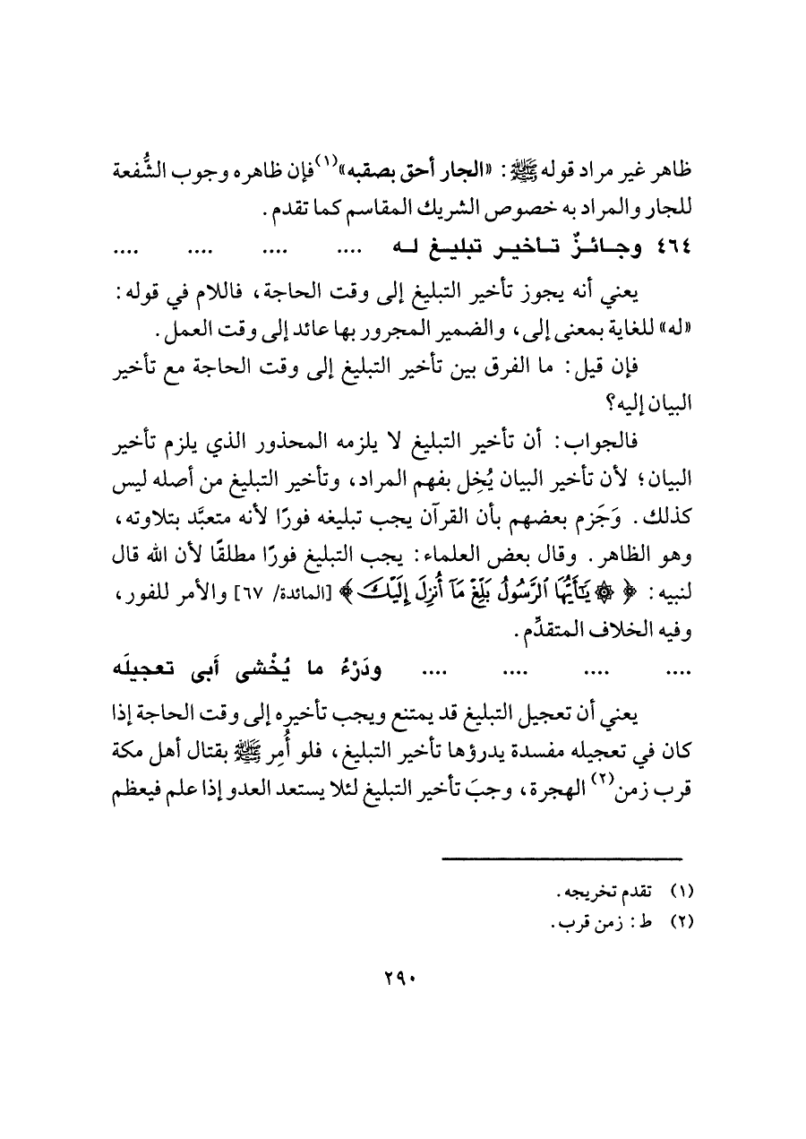 يعني أن تعجيل التبليغ قد يمتنع ويجب تأخيره إلى وقت الحاجة إذا كان في تعجيله مفسدة يدرؤها تأخير التبليغ، فلو أُمِر -صلى اللَّه عليه وسلم- بقتال أهل مكة قرب زمن (¬٢) الهجرة، وجبَ تأخير التبليغ لئلا يستعد العدو إذا علم فيعظم