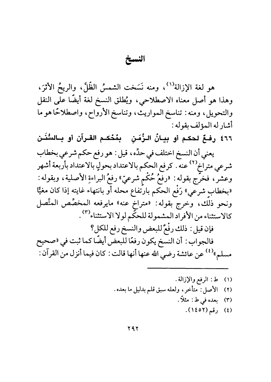 ٤٦٦ - رفعٌ لحكم أو بيانُ الزَّمَنِ ... بمُحْكم القرآن أو بالسُّنَن