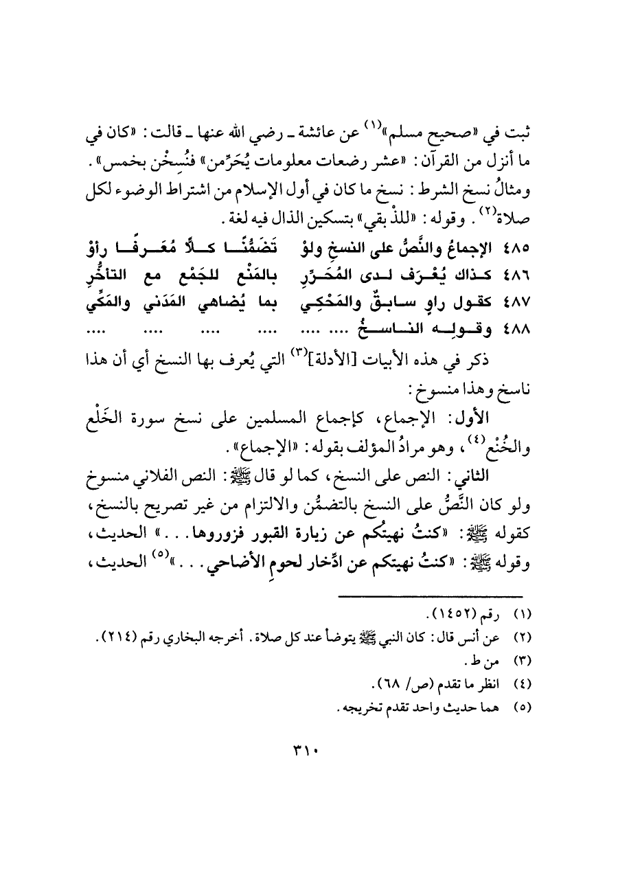 ثبت في "صحيح مسلم" (¬١) عن عائشة -رضي اللَّه عنها- قالت: "كان في ما أنزل من القرآن: "عشر رضعات معلومات يُحَرِّمن" فنُسِخْن بخمس". ومثالُ نسخ الشرط: نسخ ما كان في أول الإسلام من اشتراط الوضوء لكل صلاة (¬٢). وقوله: "للذْ بقي" بتسكين الذال فيه لغة.