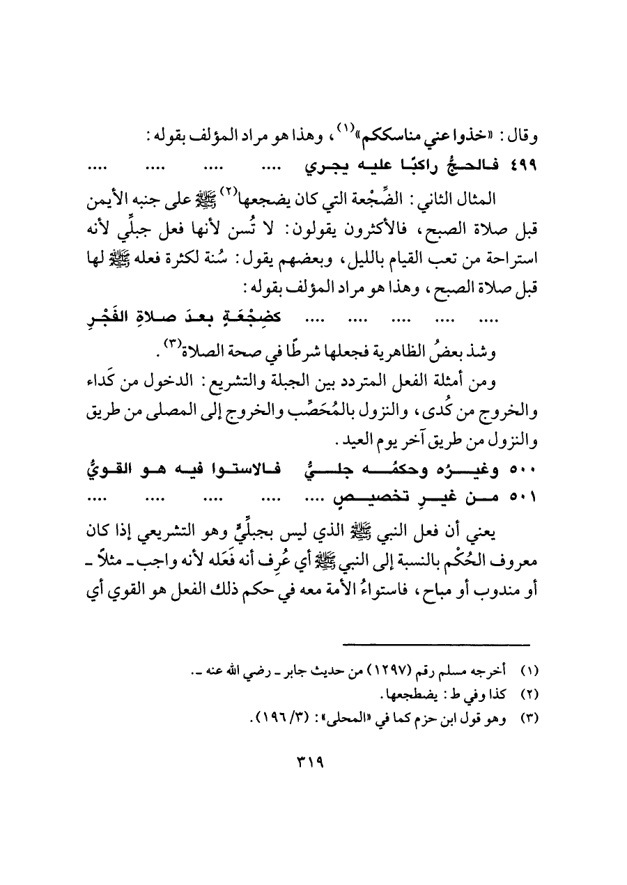 المثال الثاني: الضِّجْعة التي كان يضجعها (¬٢) -صلى اللَّه عليه وسلم- على جنبه الأيمن قبل صلاة الصبح، فالأكثرون يقولون: لا تُسن لأنها فعل جبلِّي لأنه استراحة من تعب القيام بالليل، وبعضهم يقول: سُنة لكثرة فعله -صلى اللَّه عليه وسلم- لها قبل صلاة الصبح، وهذا هو مراد المؤلف بقوله: