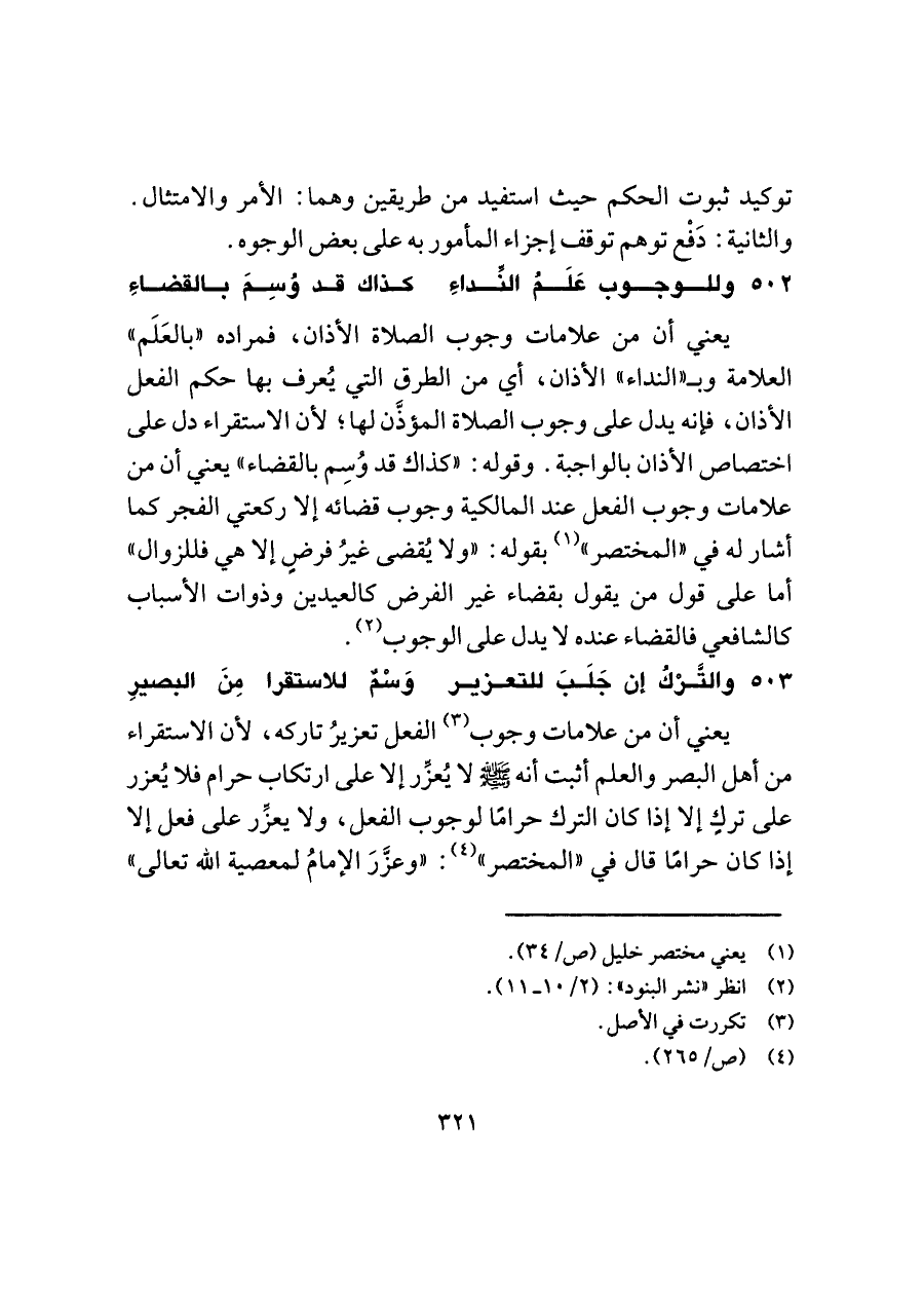 ٥٠٢ - وللوجوب عَلَمُ النِّداءِ ... كذاك قد وُسِمَ بالقضاءِ