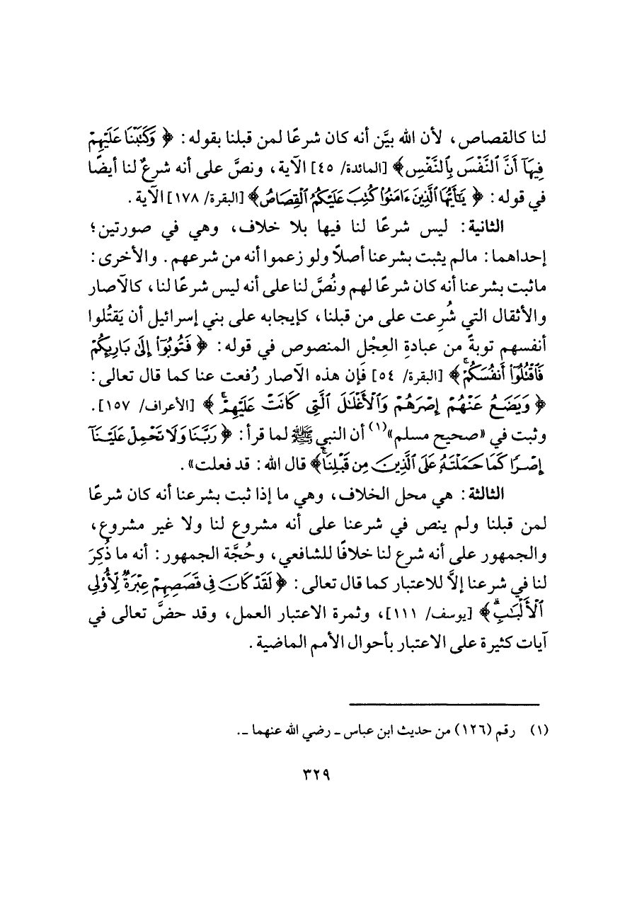 الثالثة: هي محل الخلاف، وهي ما إذا ثبت بشرعنا أنه كان شرعًا لمن قبلنا ولم ينص في شرعنا على أنه مشروع لنا ولا غير مشروع، والجمهور على أنه شرع لنا خلافًا للشافعي، وحُجَّة الجمهور: أنه ما ذُكِرَ لنا في شرعنا إلَّا للاعتبار كما قال تعالى: {لَقَدْ كَانَ فِي قَصَصِهِمْ عِبْرَةٌ لِأُولِي الْأَلْبَابِ} [يوسف/ ١١١]، وثمرة الاعتبار العمل، وقد حضَّ تعالى في آيات كثيرة على الاعتبار بأحوال الأمم الماضية.