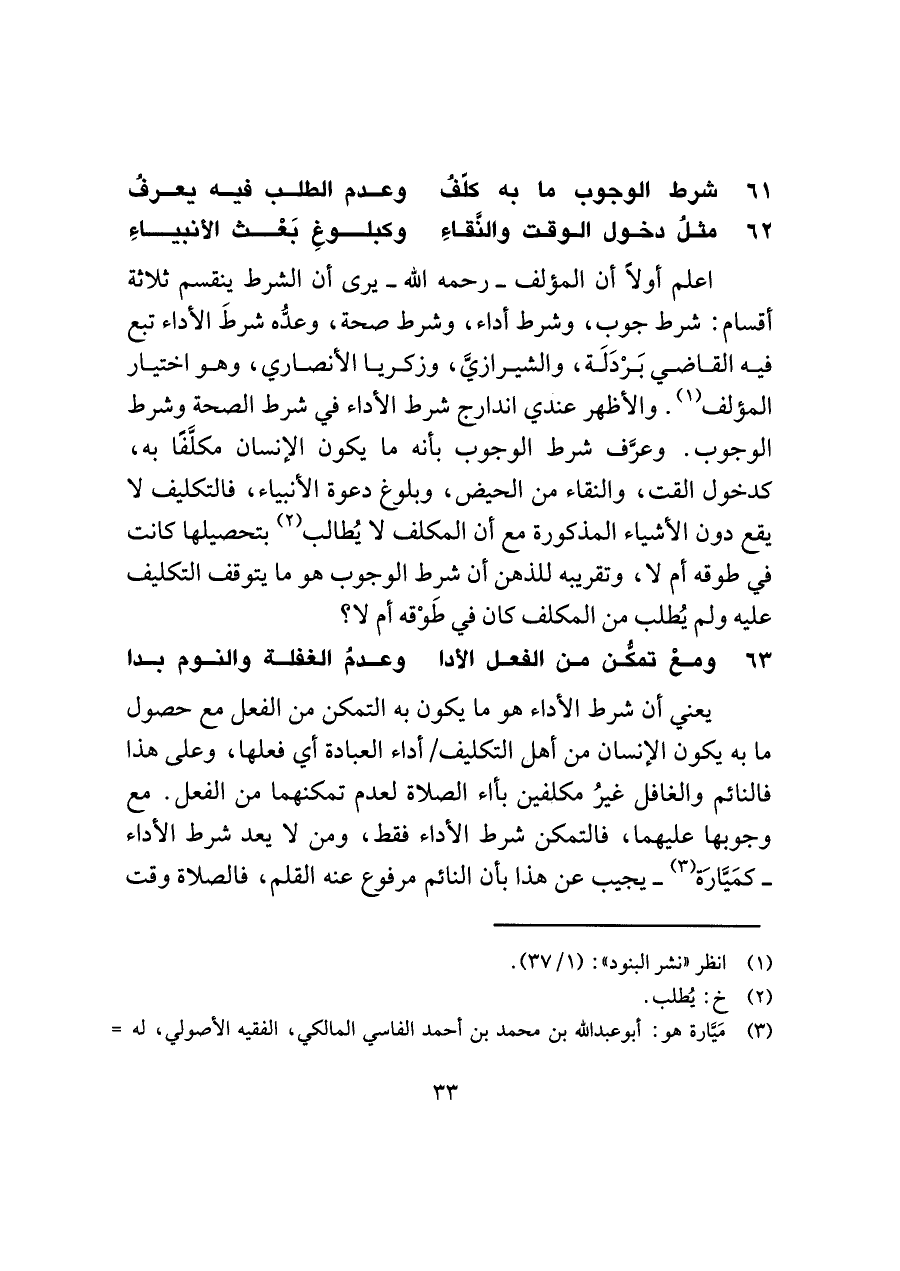 اعلم أولًا أن المؤلف -رحمه اللَّه- يرى أن الشرط ينقسم ثلاثة أقسام: شرط جوب، وشرط أداء، وشرط صحة، وعدُّه شرطَ الأداء تبع فيه القاضي بَرْدَلَة، والشيرازيَّ، وزكريا الأنصاري، وهو اختيار المؤلف (¬١). والأظهر عندي اندارج شرط الأداء في شرط الصحة وشرط الوجوب. وعرَّف شرط الوجوب بأنه ما يكون الإنسان مكلَّفًا به، كدخول الوقت، والنقاء من الحيض، وبلوغ دعوة الأنبياء، فالتكليف لا يقع دون الأشياء المذكورة مع أن المكلف لا يُطلب (¬٢) بتحصيلها كانت في طوقه أم لا، وتقريبه للذهن أن شرط الوجوب هو ما يتوقف التكليف عليه ولم يُطلب من المكلف كان في طَوْقه أم لا؟