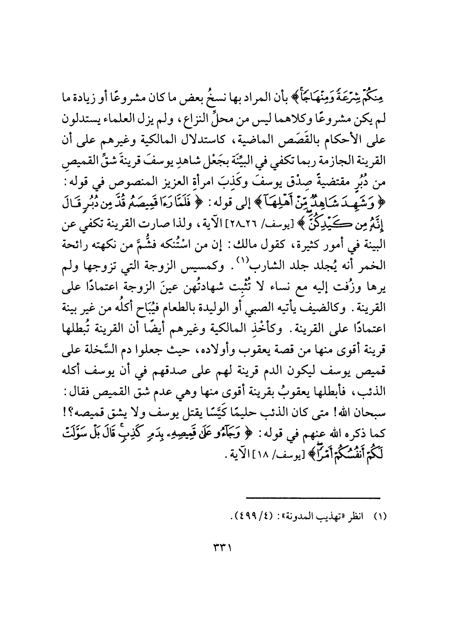 مِنْكُمْ شِرْعَةً وَمِنْهَاجًا} بأن المراد بها نسخُ بعض ما كان مشروعًا أو زيادة ما لم يكن مشروعًا وكلاهما ليس من محلِّ النزاع، ولم يزل العلماء يستدلون على الأحكام بالقَصَص الماضية، كاستدلال المالكية وغيرهم على أن القرينة الجازمة ربما تكفي في البيِّنَة بجَعْل شاهدِ يوسفَ قرينةَ شقِّ القميصِ من دُبُرِ مقتضيةً صِدْق يوسفَ وكَذِبَ امرأةِ العزيز المنصوص في قوله: {وَشَهِدَ شَاهِدٌ مِنْ أَهْلِهَا} إلى قوله: {فَلَمَّا رَأَى قَمِيصَهُ قُدَّ مِنْ دُبُرٍ قَالَ إِنَّهُ مِنْ كَيْدِكُنَّ} [يوسف/ ٢٦ - ٢٨] الآية، ولذا صارت القرينة تكفي عن البينة في أمور كثيرة، كقول مالك: إن من اسْتُنكه فشُّمَّ من نكهته رائحة الخمر أنه يُجلد جلد الشارب (¬١). وكمسيس الزوجة التي تزوجها ولم يرها وزُفت إليه مع نساء لا تُثْبِت شهادتُهن عينَ الزوجة اعتمادًا على القرينة. وكالضيف يأتيه الصبي أَو الوليدة بالطعام فيُبَاح أكلُه من غير بينة اعتمادًا على القرينة. وكأخْذِ المالكية وغيرهم أيضًا أن القرينة تُبطلها قرينة أقوى منها من قصة يعقوب وأولاده، حيث جعلوا دم السَّخلة على قميص يوسف ليكون الدم قرينة لهم على صدقهم في أن يوسف أكله الذئب، فأبطلها يعقوبُ بقرينة أقوى منها وهي عدم شق القميص فقال: سبحان اللَّه! متى كان الذئب حليمًا كَيَّسًا يقتل يوسف ولا يشق قميصه؟! كما ذكره اللَّه عنهم في قوله: {وَجَاءُوا عَلَى قَمِيصِهِ بِدَمٍ كَذِبٍ قَالَ بَلْ سَوَّلَتْ لَكُمْ أَنْفُسُكُمْ أَمْرًا} [يوسف/ ١٨] الآية.