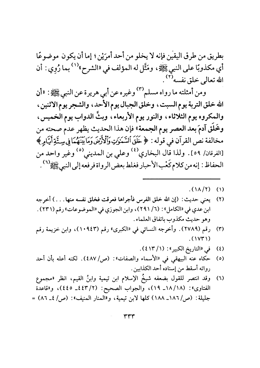بطريق من طرق اليقين فإنه لا يخلو من أحد أمرَيْن؛ إما أن يكون موضوعًا أي مكذوبًا على النبي -صلى اللَّه عليه وسلم-، ومَثَّل له المؤلف في "الشرح" (¬١) بما رُوِي: أن اللَّه تعالى خلق نفسه (¬٢).