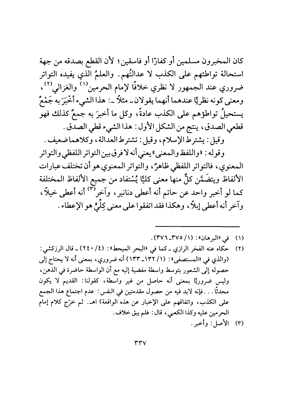 (¬٢) حكاه عنه الفخر الرازي -كما في "البحر الميحط": (٤/ ٢٤٠) - قال الزركشي: (والذي في "المستصفى": (١/ ١٣٢ - ١٣٣) أنه ضروري، بمعنى أنه لا يحتاج إلى حصوله إلى الشعور بتوسط واسطة مفضية إليه مع أن الواسطة حاضرة في الذهن، وليس ضروريًّا بمعنى أنه حاصل من غير واسطة، كقولنا: القديم لا يكون محدثًا. . . فإنه لابد فيه من حصول مقدمتين في النفس: عدم اجتماع هذا الجمع على الكذب، واتفاقهم على الإخبار عن هذه الواقعة) اهـ. ثم خرّج كلام إمام الحرمين عليه وكذا الكعبي، قال: فلم يبق خلاف.