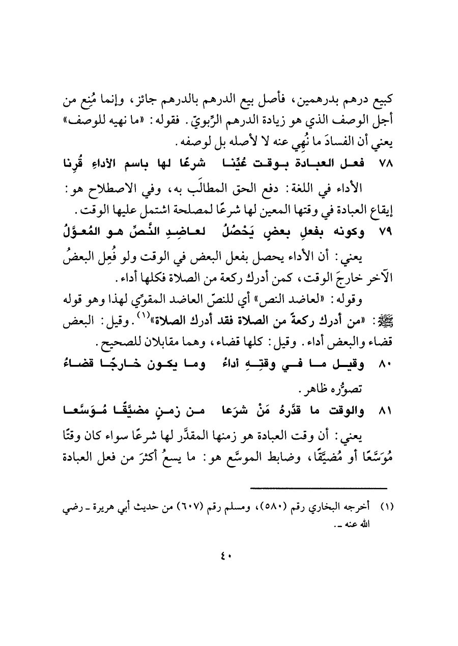 ٧٨ - فعل العبادة بوقت عيِّنا ... شرعًا لها باسم الأداءِ قُرِنا