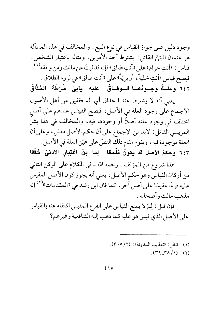 وجود دليل على جواز القياس في نوع البيع. والمخالف في هذه المسألة هو عثمان البتيُّ القائل: يشترط أحد الأمرين. ومثاله باعتبار الشخص: قياس: "أنتِ حرام" على "أنتِ طالق" فإنه قد ثبتَ عن مالك ومن وافقه (¬١). فيصح قياس "أنتِ خليَّةٌ، أو بريَّةٌ" على "أنت طالق" في لزوم الطلاق.