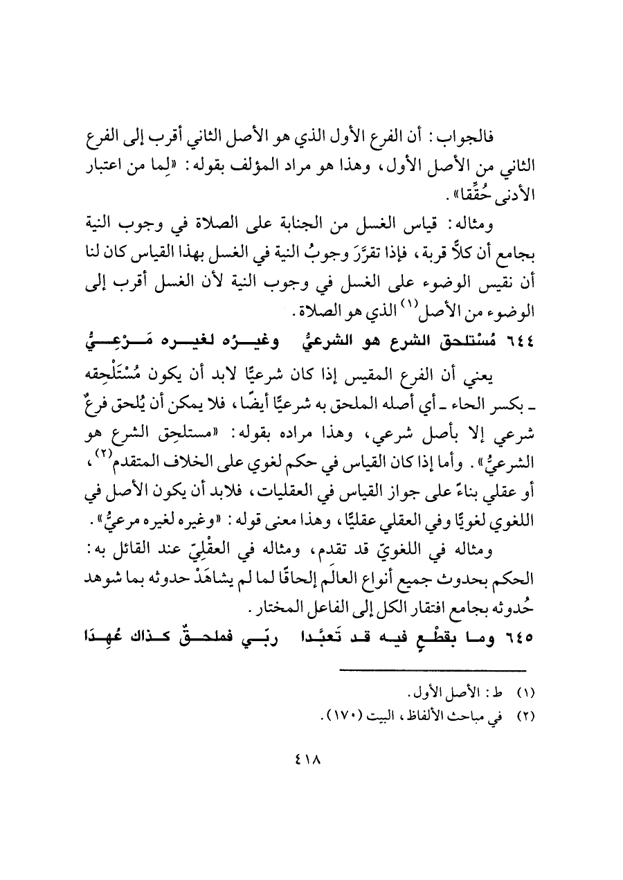 يعني أن الفرع المقيس إذا كان شرعيًّا لابد أن يكون مُسْتَلْحِقه -بكسر الحاء- أي أصله الملحق به شرعيًّا أيضًا، فلا يمكن أن يُلحق فرع شرعي إلا بأصل شرعي، وهذا مراده بقوله: "مستلحِق الشرع هو الشرعيُّ". وأما إذا كان القياس في حكم لغوي على الخلاف المتقدم (¬٢)، أو عقلي بناءً على جواز القياس في العقليات، فلابد أن يكون الأصل في اللغوي لغويًّا وفي العقلي عقليًّا، وهذا معنى قوله: "وغيره لغيره مرعيُّ".
