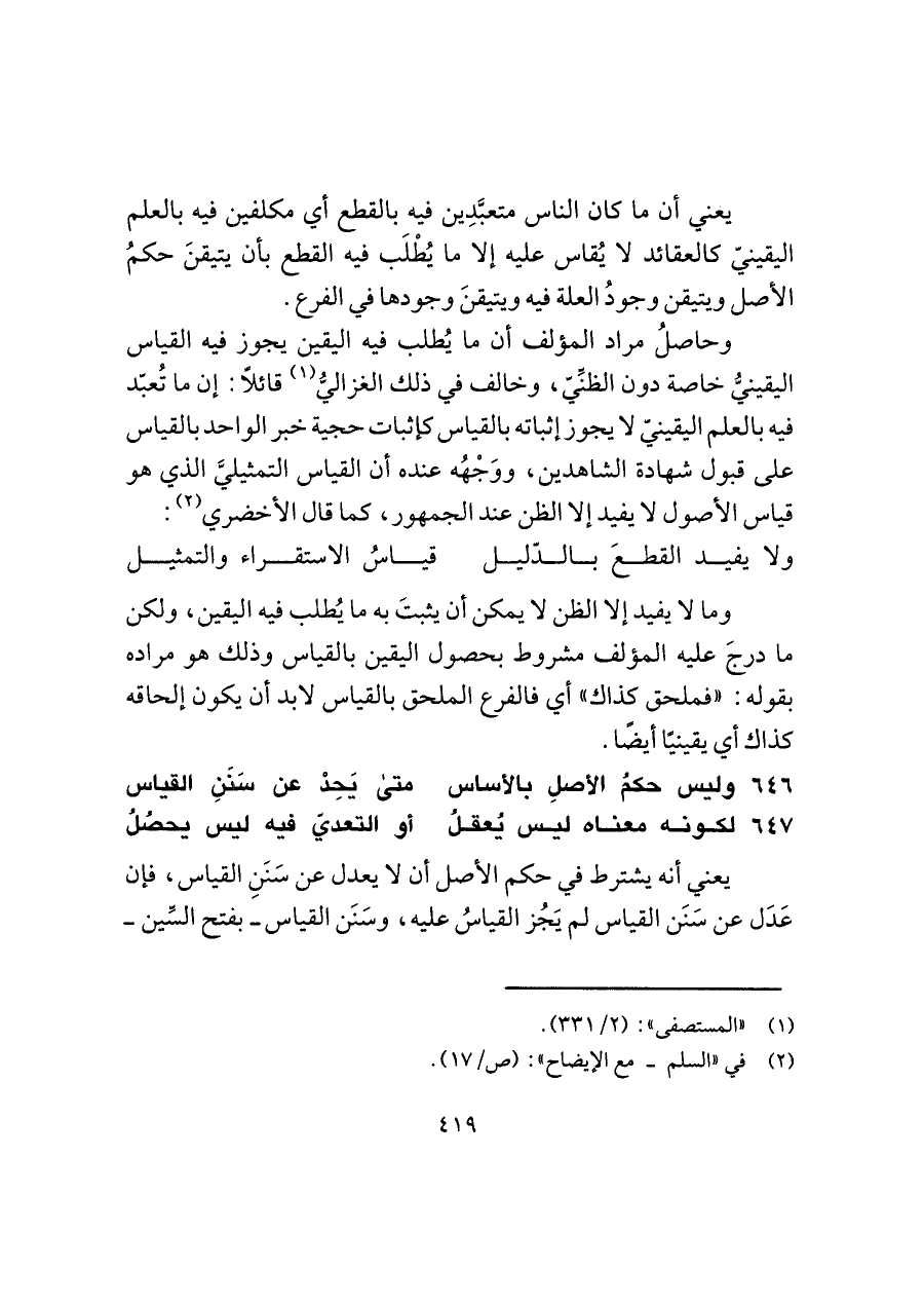 وحاصلُ مراد المؤلف أن ما يُطلب فيه اليقين يجوز فيه القياس اليقينيُّ خاصة دون الظنِّيّ، وخالف في ذلك الغزاليُّ (¬١) قائلًا: إن ما تُعبّد فيه بالعلم اليقينيّ لا يجوز إثباته بالقياس كإثبات حجية خبر الواحد بالقياس على قبول شهادة الشاهدين، ووَجْهُه عنده أن القياس التمثيليَّ الذي هو قياس الأصول لا يفيد إلا الظن عند الجمهور، كما قال الأخضري (¬٢):