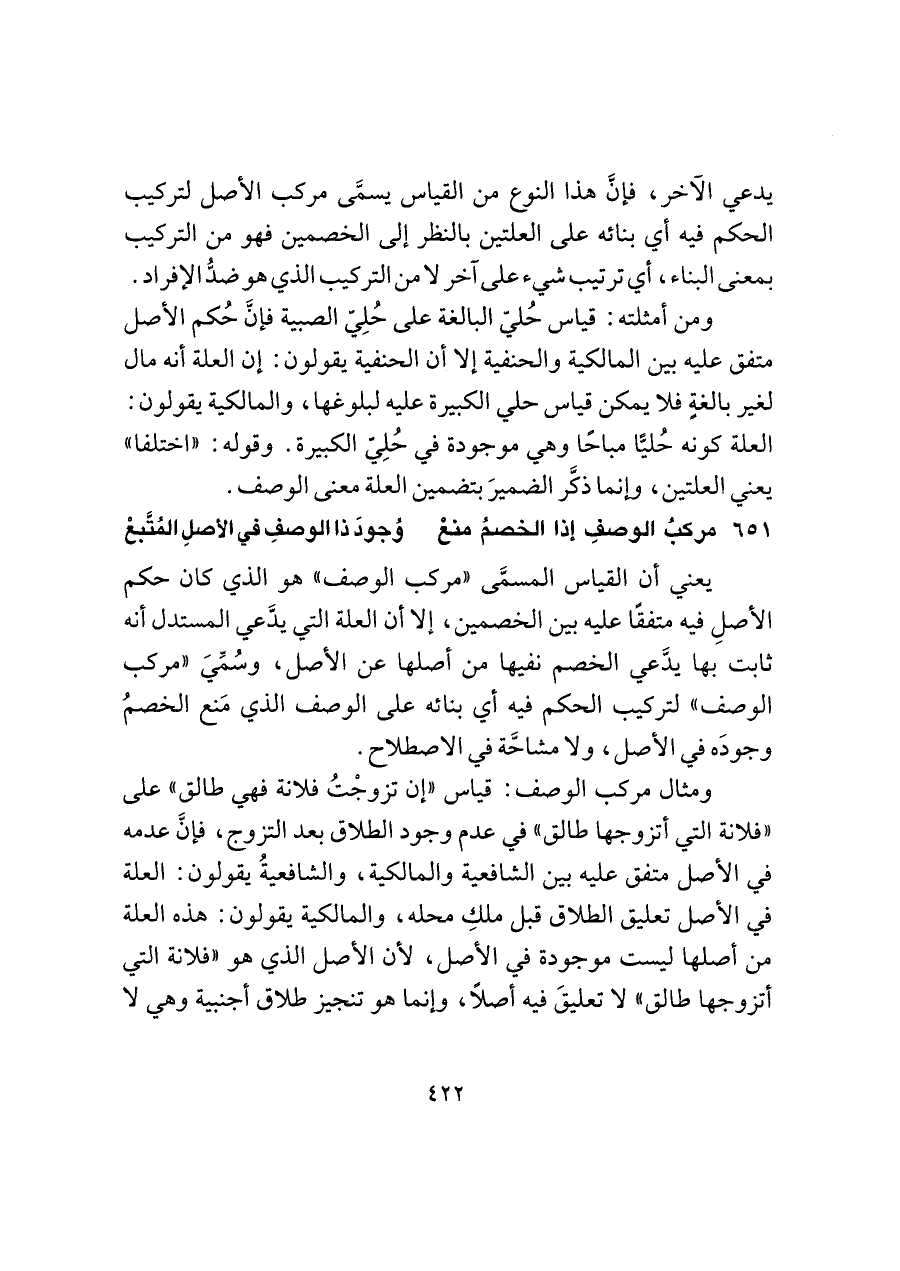 ومثال مركب الوصف: قياس "إن تزوجْتُ فلانة فهي طالق" على "فلانة التي أتزوجها طالق" في عدم وجود الطلاق بعد التزوج، فإنَّ عدمه في الأصل متفق عليه بين الشافعية والمالكية، والشافعيةُ يقولون: العلة في الأصل تعليق الطلاق قبل ملكِ محله، والمالكية يقولون: هذه العلة من أصلها ليست موجودة في الأصل، لأن الأصل الذي هو "فلانة التي أتزوجها طالق" لا تعليقَ فيه أصلًا، وإنما هو تنجيز طلاق أجنبية وهي لا