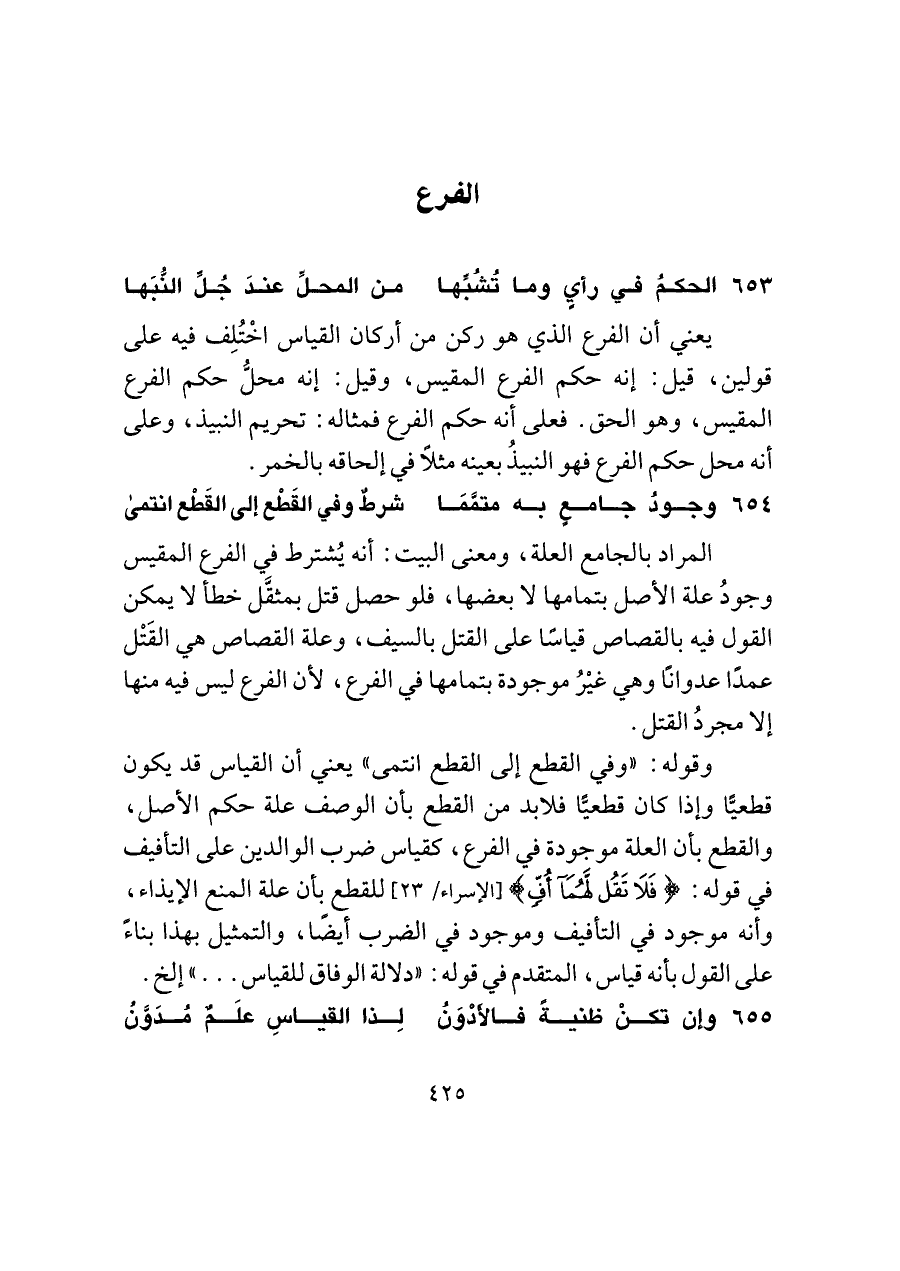 المراد بالجامع العلة، ومعنى البيت: أنه يُشترط في الفرع المقيس وجودُ علة الأصل بتمامها لا بعضها، فلو حصل قتل بمثقَّل خطأ لا يمكن القول فيه بالقصاص قياسًا على القتل بالسيف، وعلة القصاص هي القَتْل عمدًا عدوانًا وهي غيْرُ موجودة بتمامها في الفرع، لأن الفرع ليس فيه منها إلا مجردُ القتل.