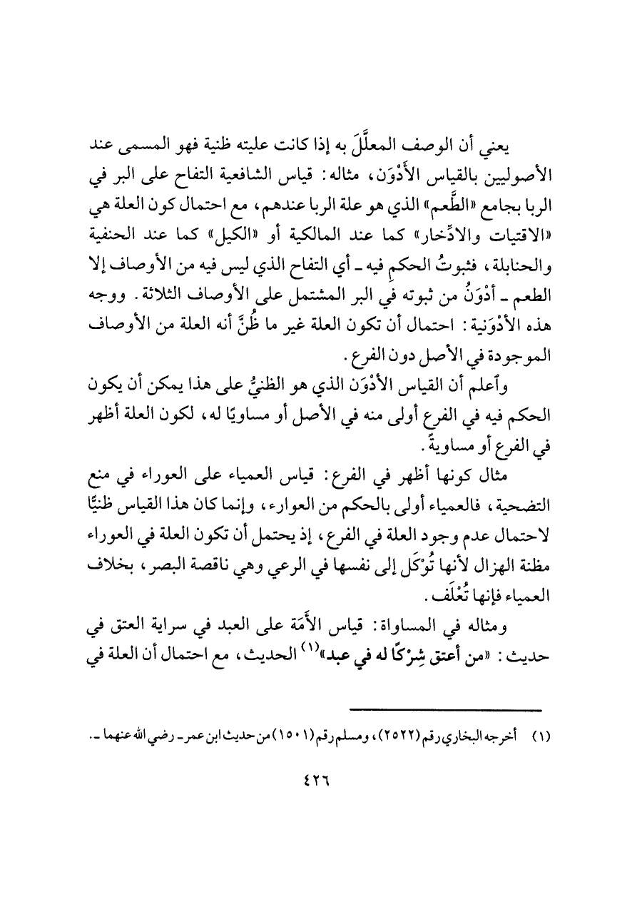 يعني أن الوصف المعلَّلَ به إذا كانت عليته ظنية فهو المسمى عند الأصوليين بالقياس الأَدْوَن، مثاله: قياس الشافعية التفاح على البر في الربا بجامع "الطَّعم" الذي هو علة الربا عندهم، مع احتمال كون العلة هي "الاقتيات والادِّخار" كما عند المالكية أو "الكيل" كما عند الحنفية والحنابلة، فثبوتُ الحكمِ فيه -أي التفاح الذي ليس فيه من الأوصاف إلا الطعم- أدْوَنُ من ثبوته في البر المشتمل على الأوصاف الثلاثة. ووجه هذه الأدْوَنية: احتمال أن تكون العلة غير ما ظُنَّ أنه العلة من الأوصاف الموجودة في الأصل دون الفرع.
