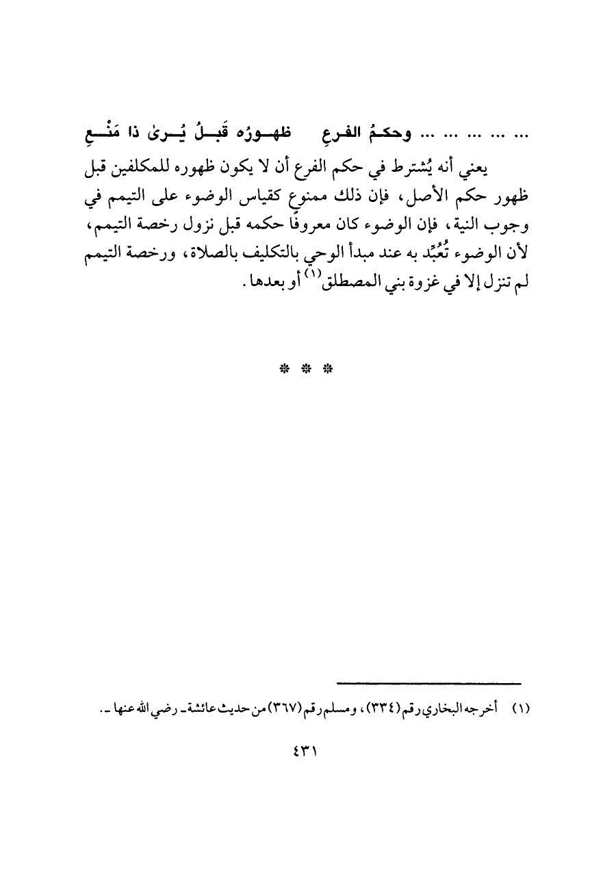 يعني أنه يُشترط في حكم الفرع أن لا يكون ظهوره للمكلفين قبل ظهور حكم الأصل، فإن ذلك ممنوع كقياس الوضوء على التيمم في وجوب النية، فإن الوضوء كان معروفًا حكمه قبل نزول رخصة التيمم، لأن الوضوء تُعُبِّد به عند مبدأ الوحي بالتكليف بالصلاة، ورخصة التيمم لم تنزل إلا في غزوة بني المصطلق (¬١) أو بعدها.