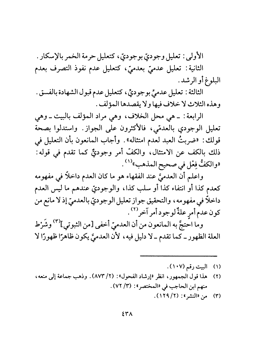 واعلم أن العدميَّ عند الفقهاء هو ما كان العدم داخلًا في مفهومه كعدم كذا أو انتفاء كذا أو سلب كذا، والوجوديّ عندهم ما ليس العدم داخلًا في مفهومه، والتحقيق جواز تعليل الوجوديّ بالعدميّ إذ لا مانع من كون عدم أمرٍ علةٌ لوجود أمر آخر (¬٢).
