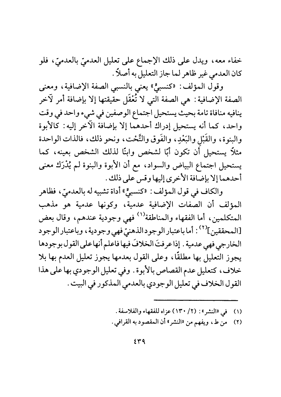 والكاف في قول المؤلف: "كنسبيٍّ" أداة تشبيه له بالعدميّ، فظاهر المؤلف أن الصفات الإضافية عدمية، وكونها عدمية هو مذهب المتكلمين، أما الفقهاء والمناطقة (¬١) فهي وجودية عندهم، وقال بعض [المحققين] (¬٢): أما باعتبار الوجود الذهنيّ فهي وجودية، وباعتبار الوجود الخارجي فهي عدمية. إذا عرفتَ الخلافَ فيها فاعلم أنها على القول بوجودها يجوز التعليل بها مطلقًا، وعلى القول بعدمها يجوز تعليل العدم بها بلا خلاف، كتعليل عدم القصاص بالأبوة. وفي تعليل الوجودي بها على هذا القول الخلاف في تعليل الوجودي بالعدمي المذكور في البيت.