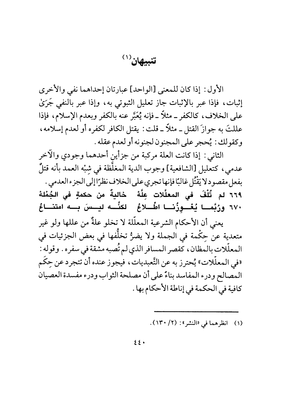 الأول: إذا كان للمعنى [الواحد] عبارتان إحداهما نفي والأخرى إثبات، فإذا عبر بالإثبات جاز تعليل الثبوتي به، وإذا عبر بالنفي جَرَى على الخلاف، كالكفر -مثلًا- فإنه يُعَبَّر عنه بالكفر وبعدم الإسلام، فإذا عللتَ به جوازَ القتل -مثلًا- قلت: يقتل الكافر لكفره أو لعدم إسلامه، وكقولك: يُحجر على المجنون لجنونه أو لعدم عقله.