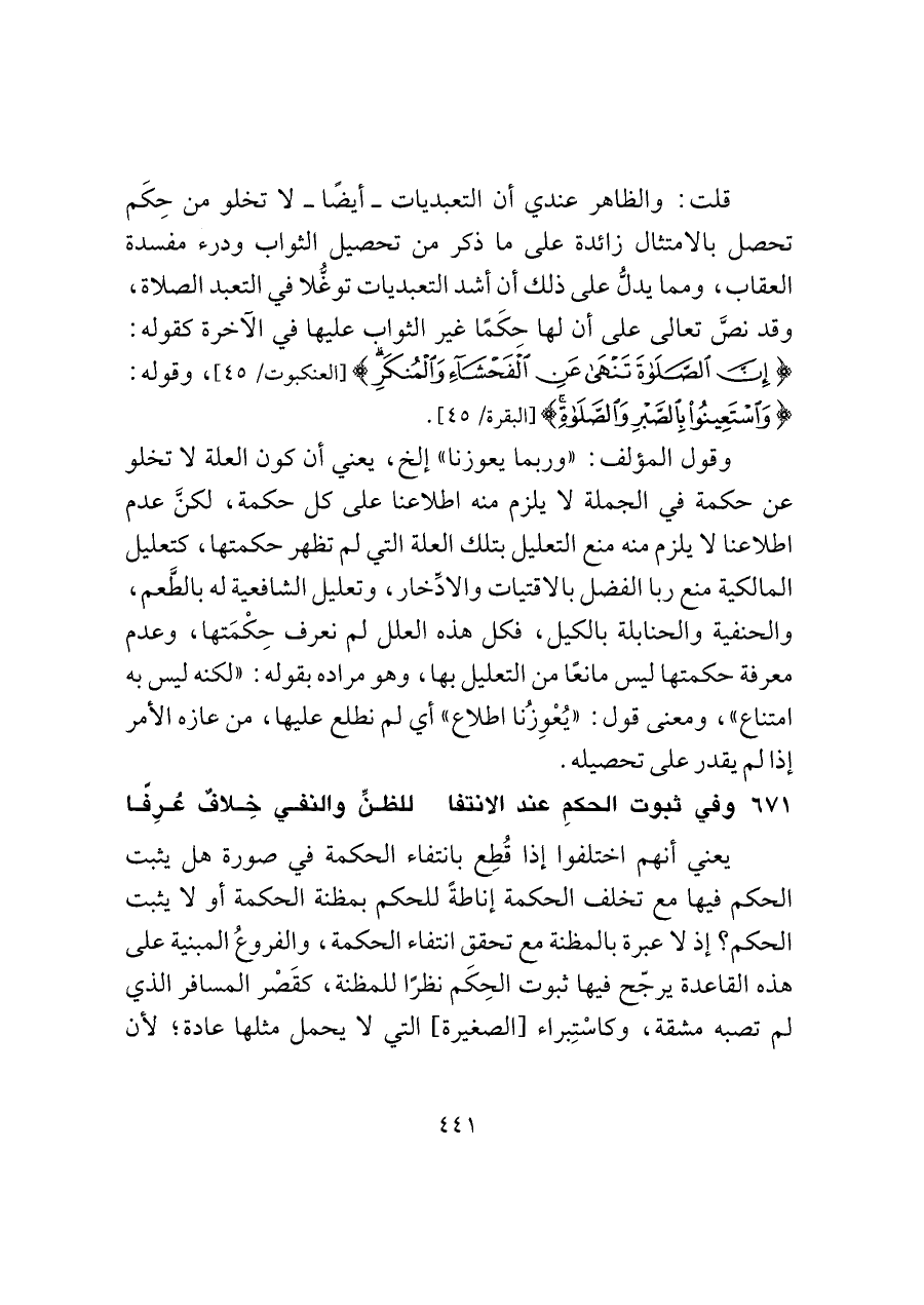 قلت: والظاهر عندي أن التعبديات -أيضًا- لا تخلو من حِكَم تحصل بالامتثال زائدة على ما ذكر من تحصيل الثواب ودرء مفسدة العقاب، ومما يدلُّ على ذلك أن أشد التعبديات توغُّلا في التعبد الصلاة، وقد نصَّ تعالى على أن لها حكَمًا غير الثواب عليها في الآخرة كقوله: {إِنَّ الصَّلَاةَ تَنْهَى عَنِ الْفَحْشَاءِ وَالْمُنْكَرِ} [العنكبوت/ ٤٥]، وقوله: {وَاسْتَعِينُوا بِالصَّبْرِ وَالصَّلَاةِ} [البقرة/ ٤٥].