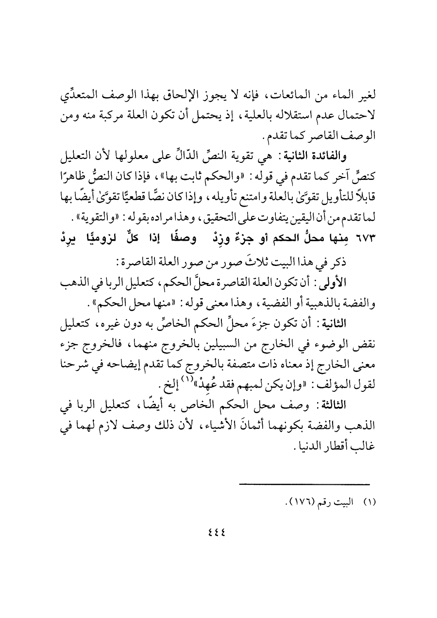 ٦٧٣ - مِنها محلُّ الحكم أو جزءٌ وزِدْ ... وصفًا إذا كل لزوميًّا يرِدْ