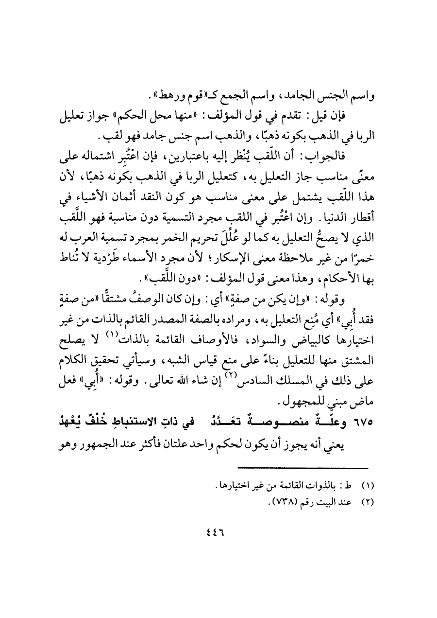 فإن قيل: تقدم في قول المؤلف: "منها محل الحكم" جواز تعليل الربا في الذهب بكونه ذهبًا، والذهب اسم جنس جامد فهو لقب.