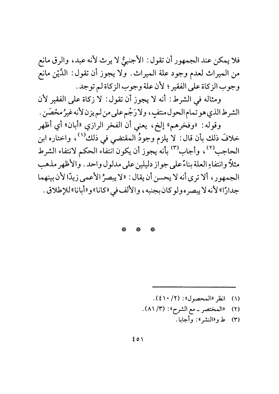 فلا يمكن عند الجمهور أن تقول: الأجنبيُّ لا يرث لأنه عبد، والرق مانع من الميراث لعدم وجود علة الميراث. ولا يجوز أن تقول: الدَّيْن مانع وجوب الزكاة على الفقير؛ لأن علة وجوب الزكاة لم توجد.