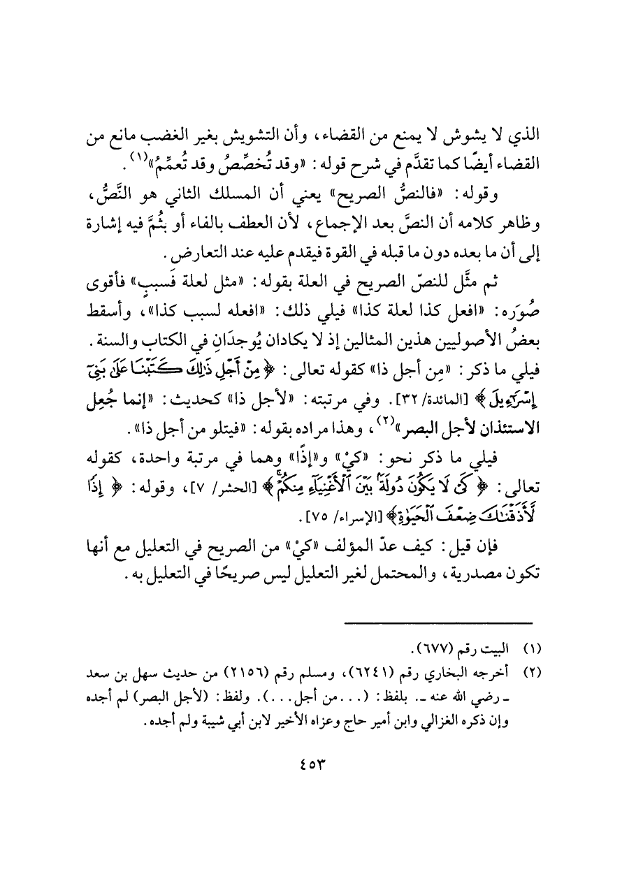 ثم مثَّل للنصّ الصريح في العلة بقوله: "مثل لعلة فسببٍ" فأقوى صُوَره: "افعل كذا لعلة كذا" فيلي ذلك: "افعله لسبب كذا"، وأسقط بعضُ الأصوليين هذين المثالين إذ لا يكادان يُوجدَانِ في الكتاب والسنة. فيلي ما ذكر: "مِن أجل ذا" كقوله تعالى: {مِنْ أَجْلِ ذَلِكَ كَتَبْنَا عَلَى بَنِي إِسْرَائِيلَ} [المائدة/ ٣٢]. وفي مرتبته: "لأجل ذا" كحديث: "إنما جُعِل الاستئذان لأجل البصر" (¬٢)، وهذا ماده بقوله: "فيتلو من أجل ذا".