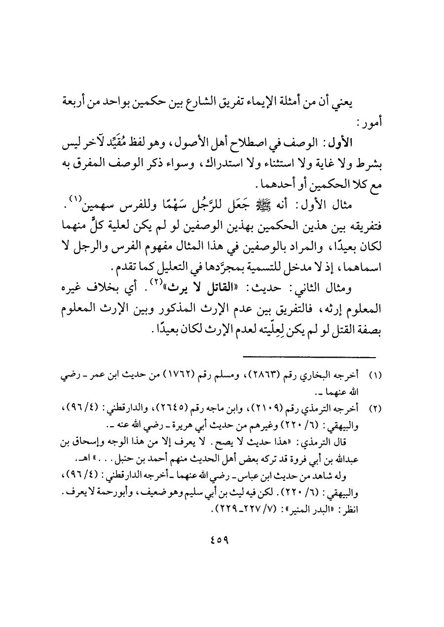 ومثال الثاني: حديث: "القاتل لا يرث" (¬٢). أي بخلاف غيره المعلوم إرثه، فالتفريق بين عدم الإرث المذكور وبين الإرث المعلوم بصفة القتل لو لم يكن لِعِلّيته لعدم الإرث لكان بعيدًا.