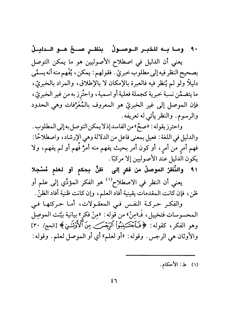 ٩١ - والنَّظرُ الموصلُ من فكرٍ إلى ... ظنٍّ بحكمٍ أو لعلمٍ مُسْجلا