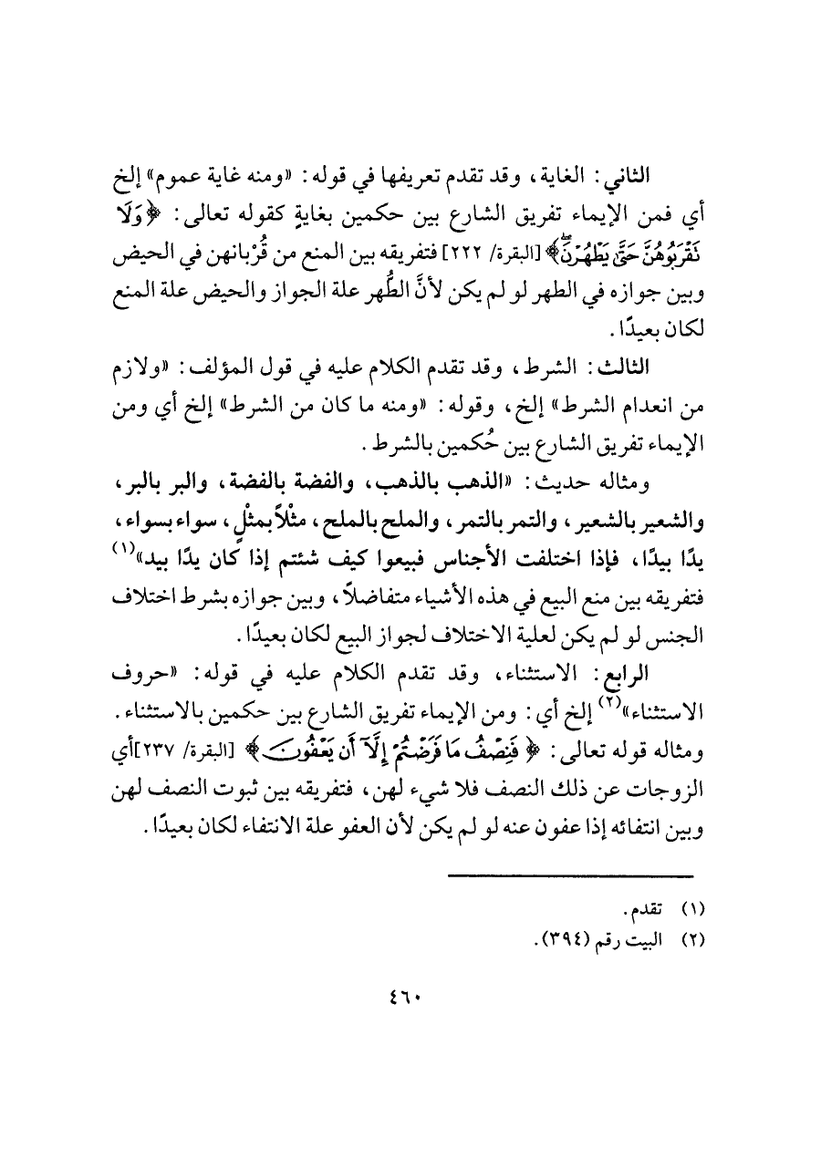 الرابع: الاستثناء، وقد تقدم الكلام عليه في قوله: "حروف الاستثناء" (¬٢) إلخ أي: ومن الإيماء تفريق الشارع بين حكمين بالاستثناء. ومثاله قوله تعالى: {فَنِصْفُ مَا فَرَضْتُمْ إِلَّا أَنْ يَعْفُونَ} [البقرة/ ٢٣٧] أي الزوجات عن ذلك النصف فلا شيء لهن، فتفريقه بين ثبوت النصف لهن وبين انتفائه إذا عفون عنه لو لم يكن لأن العفو علة الانتفاء لكان بعيدًا.