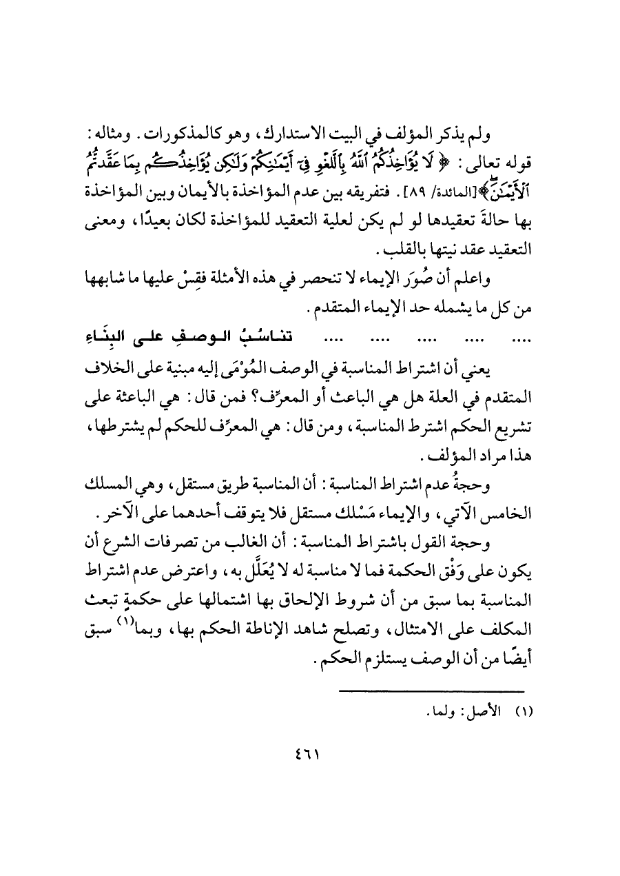 ولم يذكر المؤلف في البيت الاستدارك، وهو كالمذكورات. ومثاله: قوله تعالى: {لَا يُؤَاخِذُكُمُ اللَّهُ بِاللَّغْوِ فِي أَيْمَانِكُمْ وَلَكِنْ يُؤَاخِذُكُمْ بِمَا عَقَّدْتُمُ الْأَيْمَانَ} [المائدة/ ٨٩]. فتفريقه بين عدم المؤاخذة بالأيمان وبين المؤاخذة بها حالةَ تعقيدها لو لم يكن لعلية التعقيد للمؤاخذة لكان بعيدًا، ومعنى التعقيد عقد نيتها بالقلب.