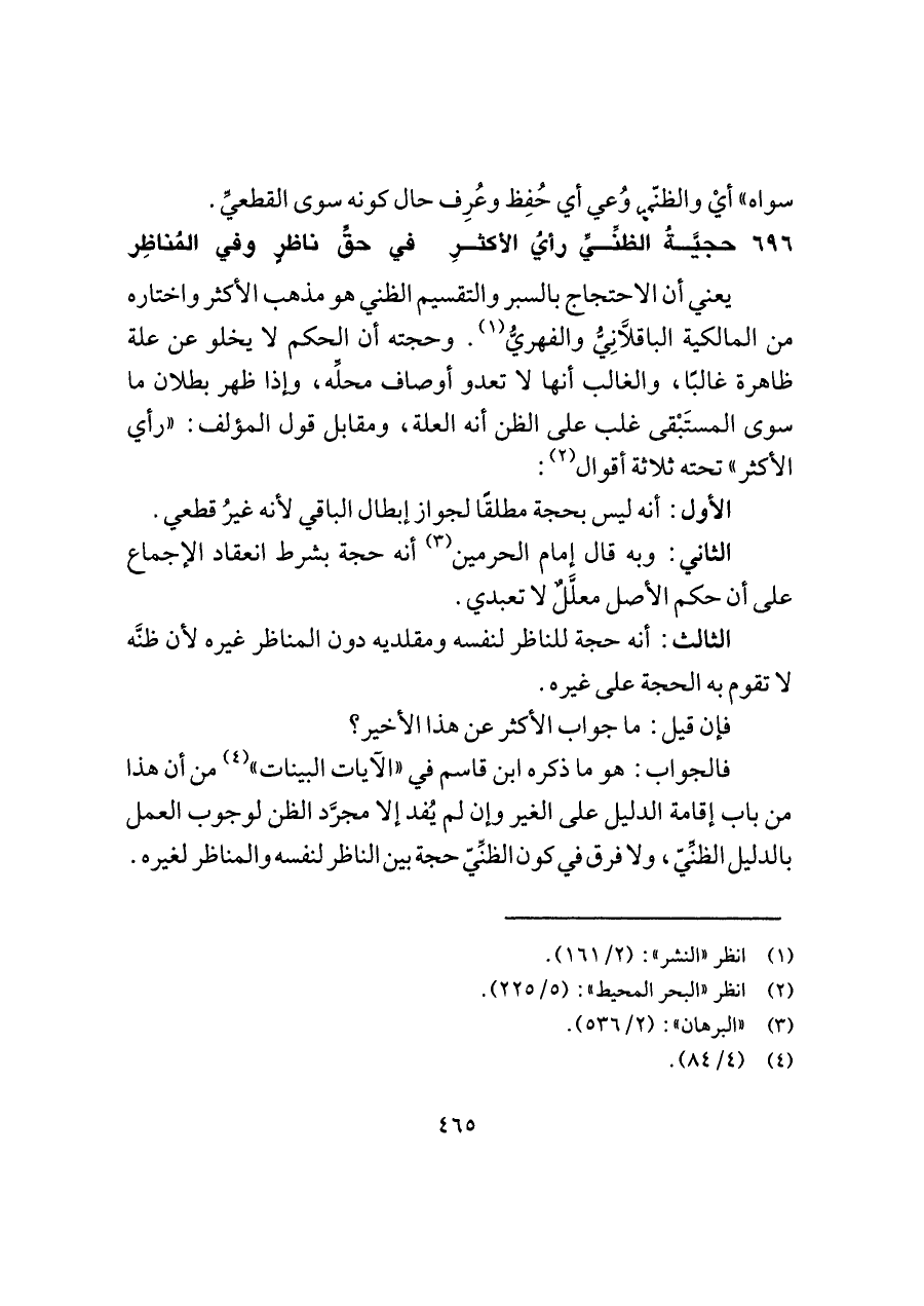 ٦٩٦ - حجيَّة الظنِّيِّ رأيُ الأكثرِ ... في حقِّ ناظرٍ وفي المُناظِر