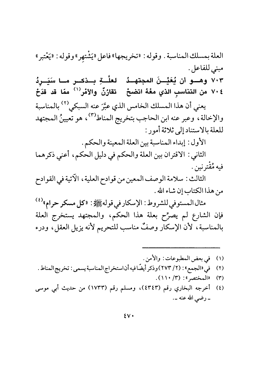 ٧٠٣ - وهو أن يُعَيِّنَ المجتهدُ ... لعلَّةِ بذكر ما سَيَرِدُ