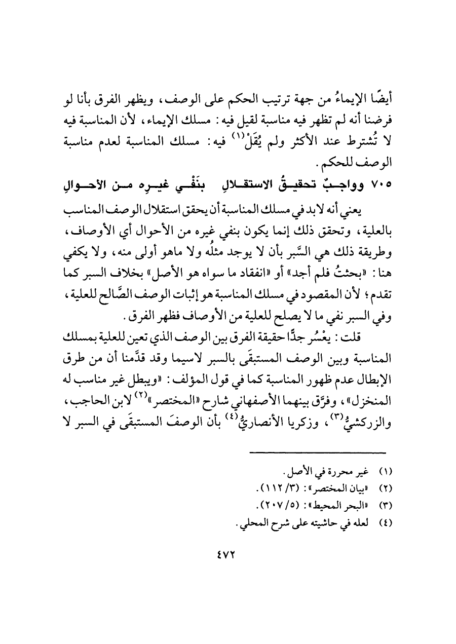 قلت: يعْسُر جدًّا حقيقة الفرق بين الوصف الذي تعين للعلية بمسلك المناسبة وبين الوصف المستبقَى بالسبر لاسيما وقد قدَّمنا أن من طرق الإبطال عدم ظهور المناسبة كما في قول المؤلف: "ويبطل غير مناسب له المنخزل"، وفرَّق بينهما الأصفهاني شارح "المختصر" (¬٢) لابن الحاجب، والزركشيُّ (¬٣)، وزكريا الأنصاريُّ (¬٤) بأن الوصفَ المستبقَى في السبر لا