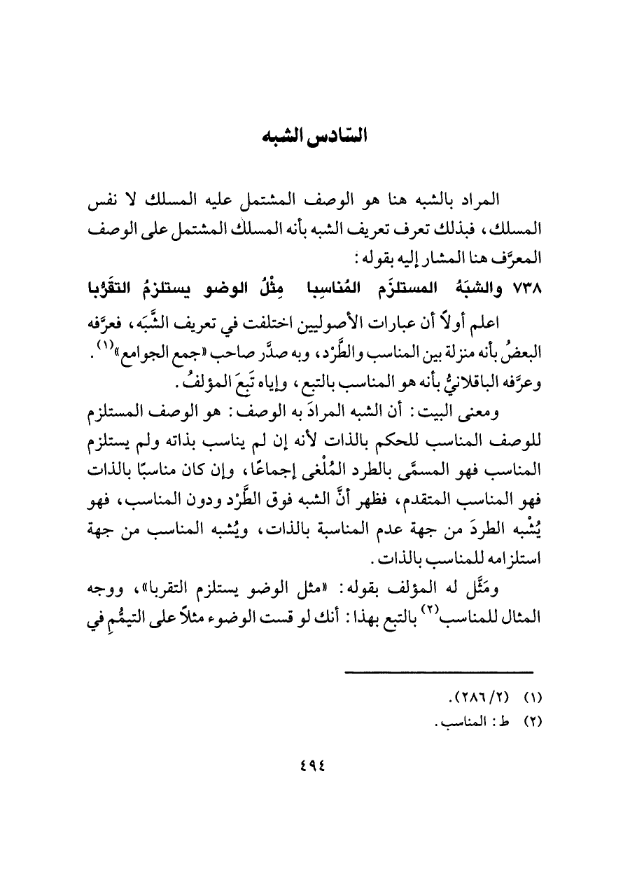 ٧٣٨ - والشبَهُ المستلزَم المُناسِبا ... مِثْلُ الوضو يستلزمُ التقَرُّبا