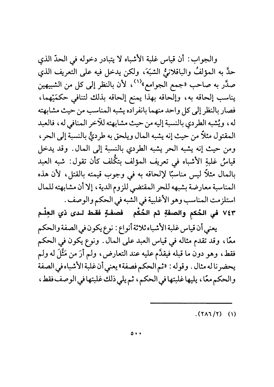 والجواب: أن قياس غلبة الأشباه لا يتبادر دخوله في الحدّ الذي حدَّ به المؤلفُ والباقلانيُّ الشبَهَ، ولكن يدخل فيه على التعريف الذي صدَّر به صاحب "جمع الجوامع" (¬١)، لأن بالنظر إلى كل من الشبيهين يناسب إلحاقه به، وإلحاقه بهذا يمنع إلحاقه بذلك لتنافي حكمَيْهما، فصار بالنظر إلى كل واحد منهما بانفراده يشبه المناسب من حيث مشابهته له، ويُشبه الطردي بالنسبة إليه من حيث مشابهته للآخر المنافي له، فالعبد المقتول مثلًا من حيث إنه يشبه المال ويلحق به طرديُّ بالنسبة إلى الحر، ومن حيث إنه يشبه الحر يشبه الطردي بالنسبة إلى المال. وقد يدخل قياسُ غلبةِ الأشباه في تعريف المؤلف بتكُّلف كأن تقول: شبه العبد بالمال مثلًا ليس مناسبًا لإلحاقه به في وجوب قيمته بالقتل، لأن هذه المناسبة معارضة بشبهه للحر المقتضي للزوم الدية، إلا أن مشابهته للمال استلزمت المناسب وهو الأغلبية في الشبه في الحكم والوصف.