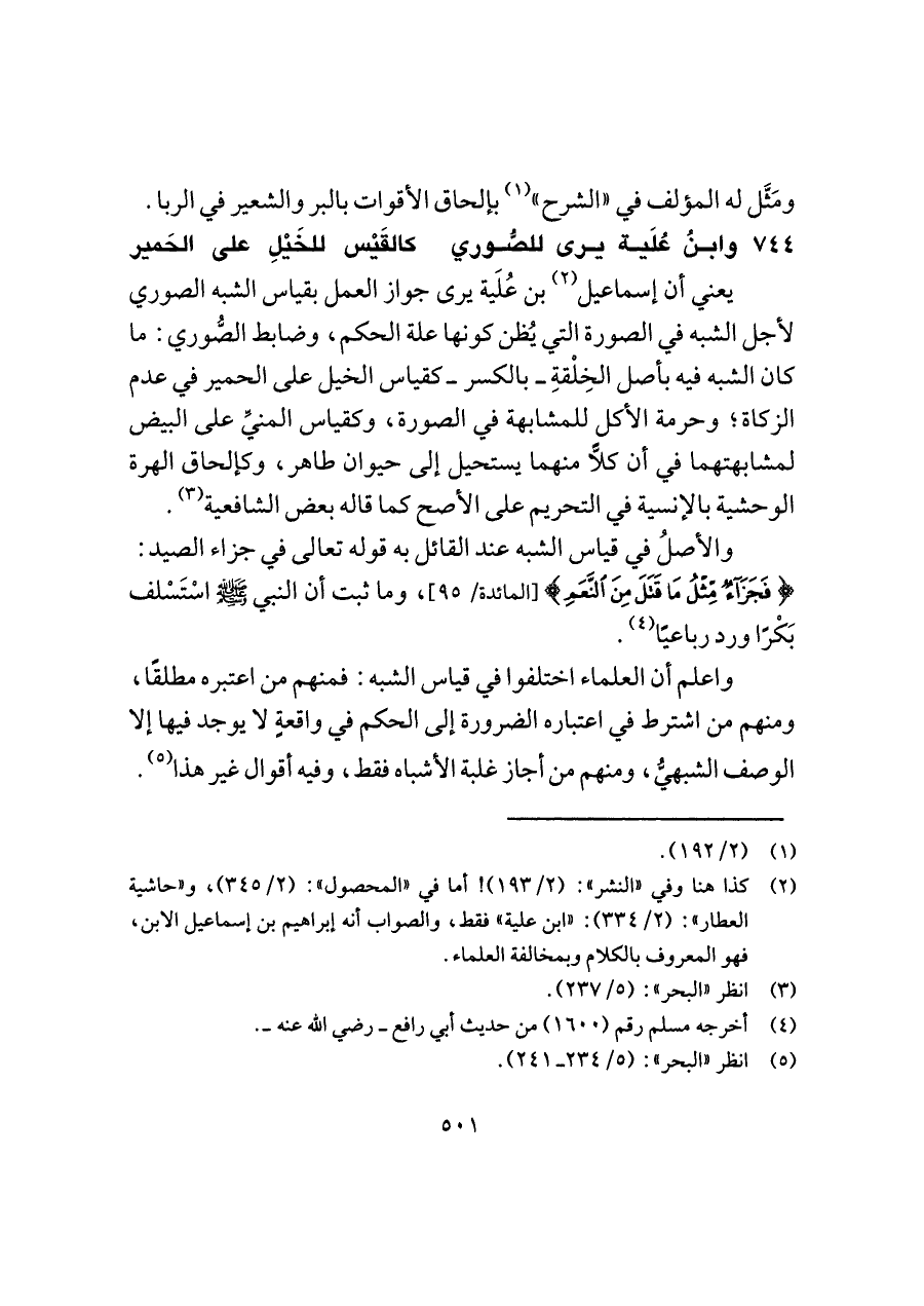 يعني أن إسماعيل بن عُلَية يرى جواز العمل بقياس الشبه الصوري لأجل الشبه في الصورة التي يُظن كونها علة الحكم، وضابط الصُّوري: ما كن الشبه فيه بأصل الخِلْقةِ -بالكسر- كقياس الخيل على الحمير في عدم الزكاة؛ وحرمة الأكل للمشابهة في الصورة، وكقياس المنيِّ على البيض لمشابهتهما في أن كلًّا منهما يستحيل إلى حيوان طاهر، وكإلحاق الهرة الوحشية بالإنسية في التحريم على الأصح كما قاله بعض الشافعية (¬٢).