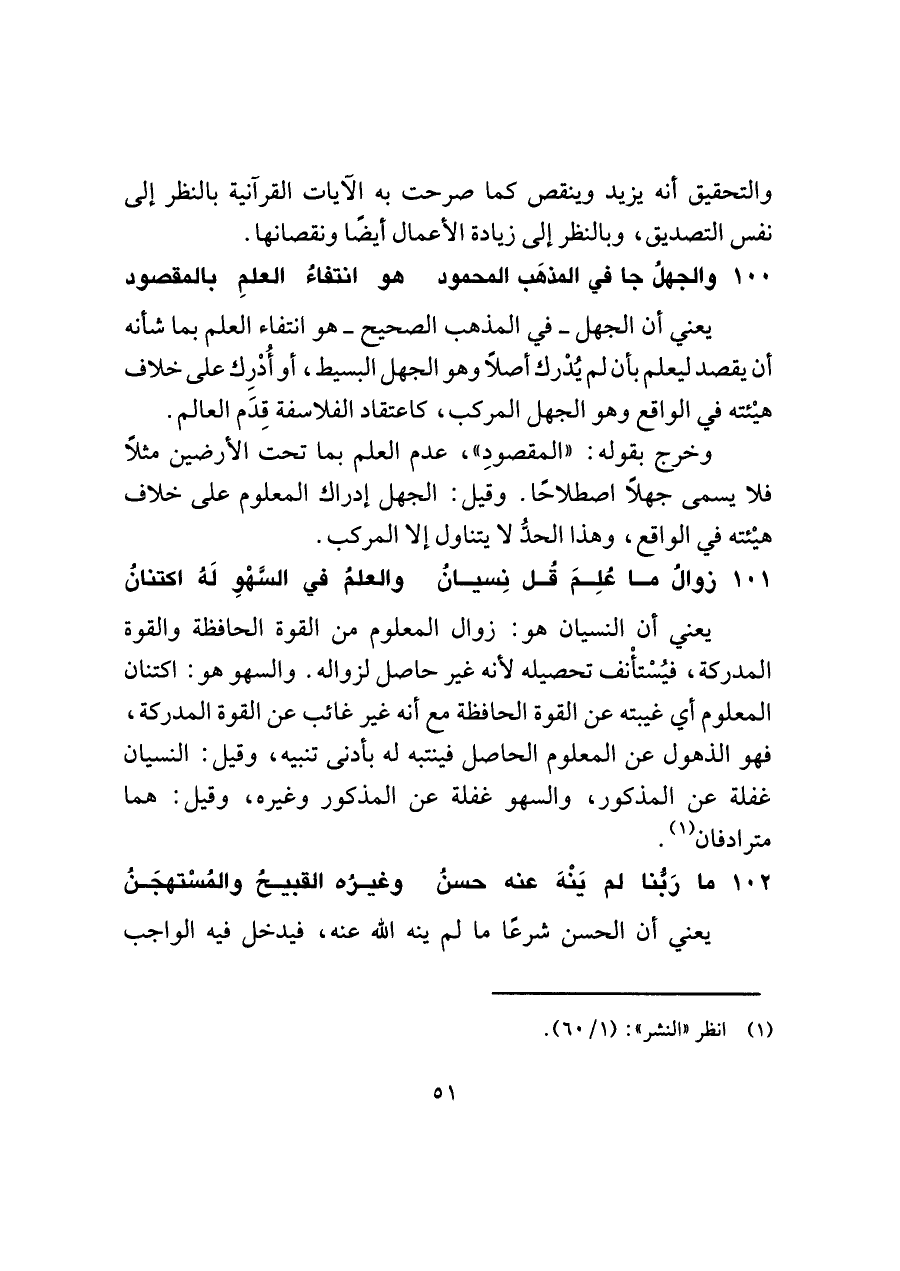 ١٠٠ - والجهلُ جافي المذهَب المحمود ... هو انتفاءُ العلمِ بالمقصود