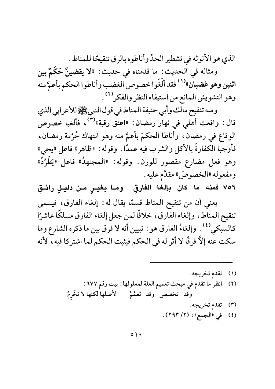 ٧٥٦ - فمنه ما كان بإلغا الفارقِ ... وما بغيرٍ من دليلٍ رائقِ